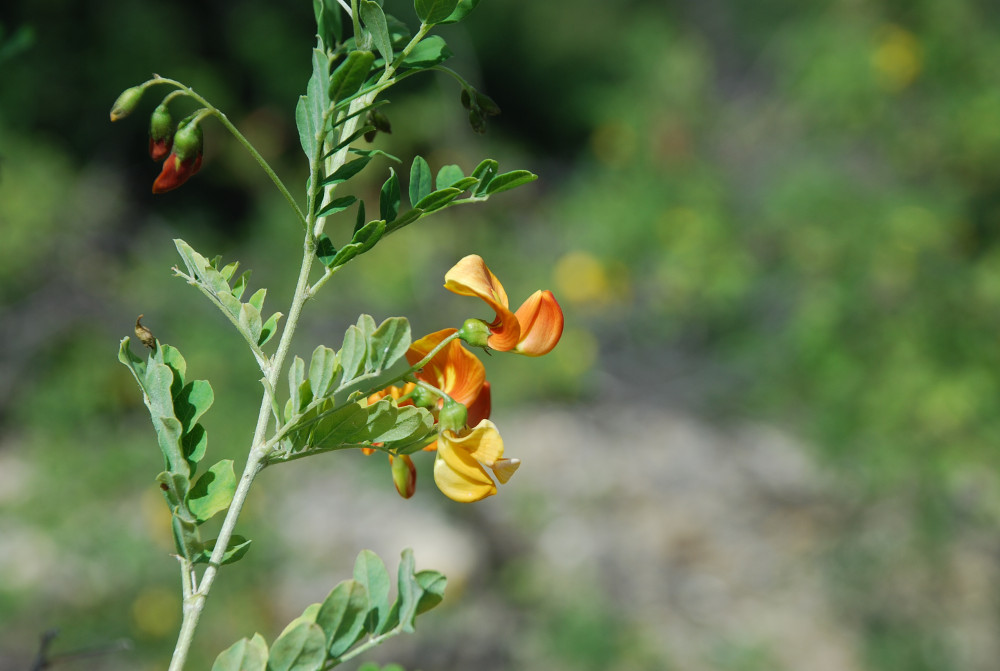 Fleurs en petites grappes ; étendard présentant une marque circulaire brun-rouge ; petit calice tubulé à cinq dents ; corolle jaune papilionacée.
