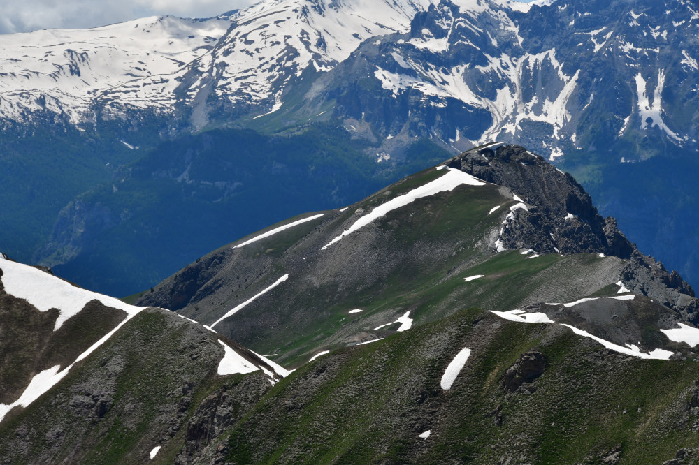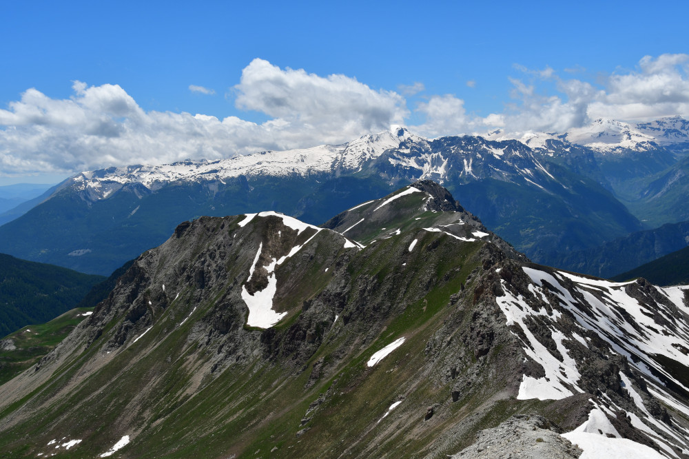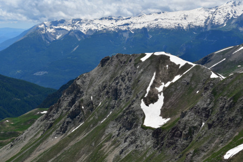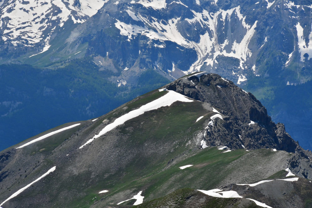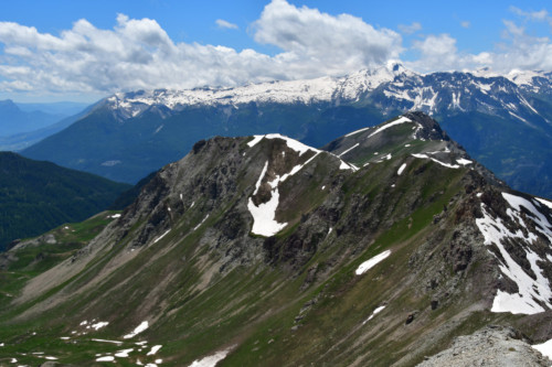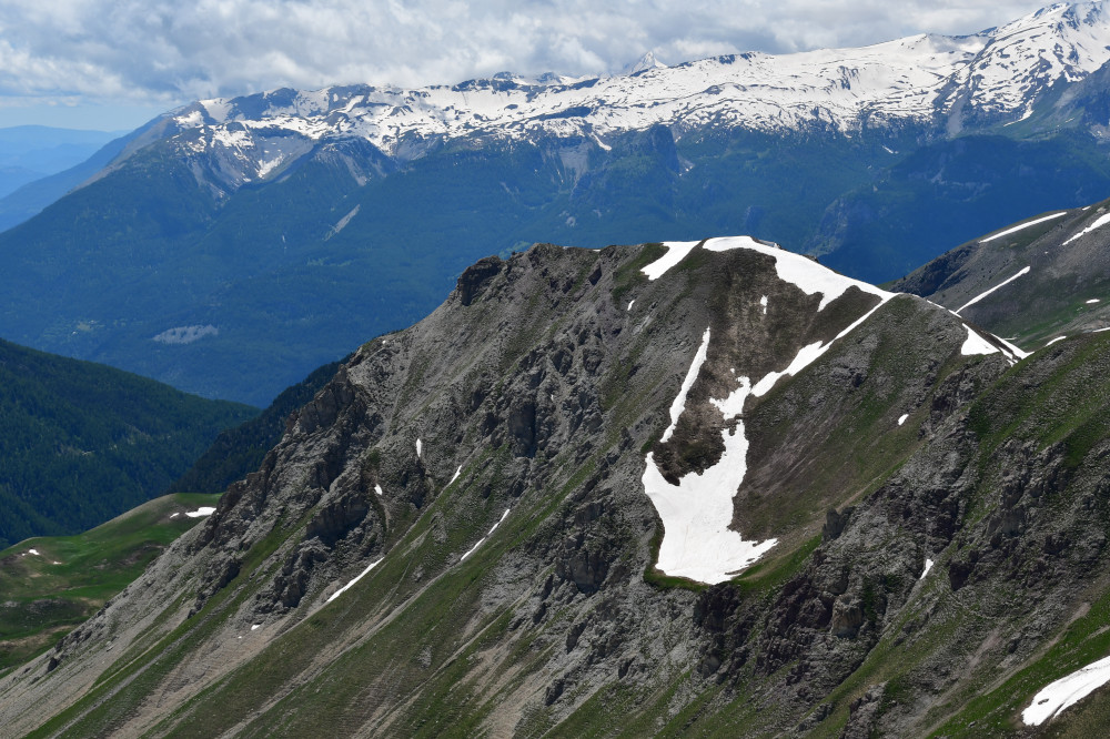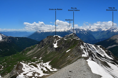 Juste derrière la Croix de Ratier, on aperçoit le pic du Grand Vallon. Et, au loin, en arrière plan, on peut voir la Tête de Vautisse.