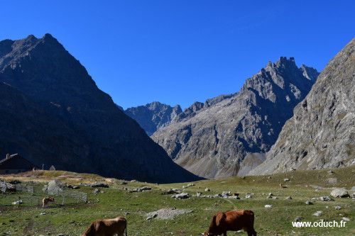La roche d'Alvau est observée depuis le refuge de l'Alpe de Villar-d'Arêne, donc vue du nord-nord-est à une distance de 6,7 km.