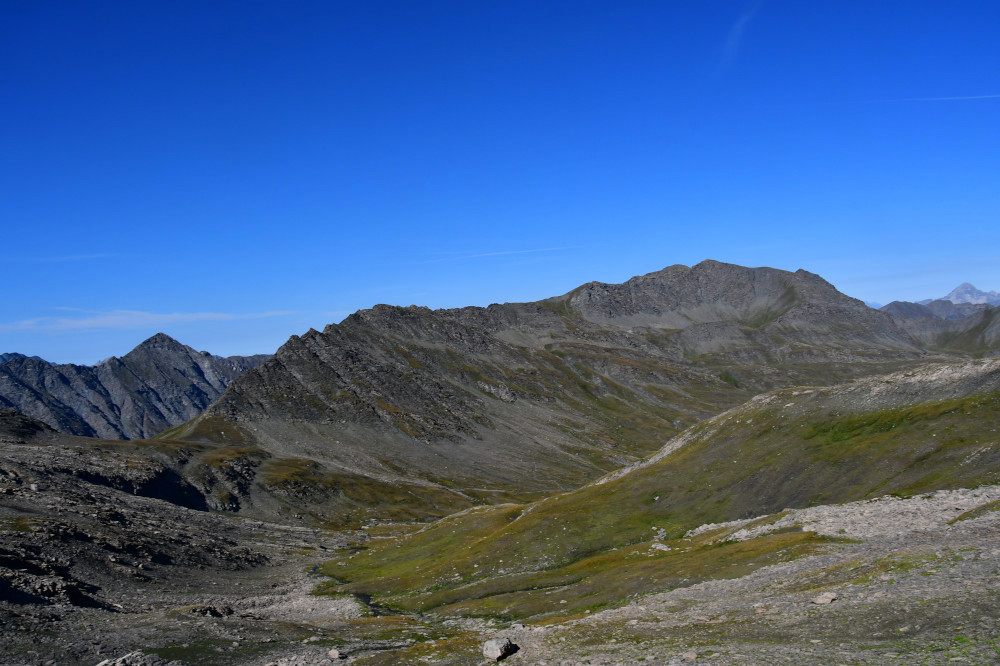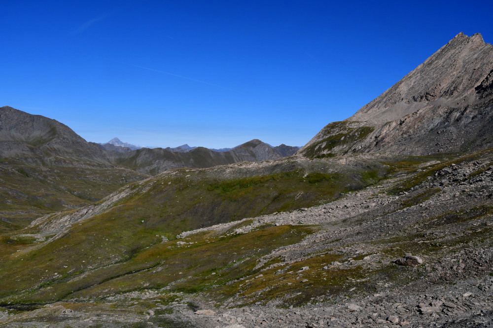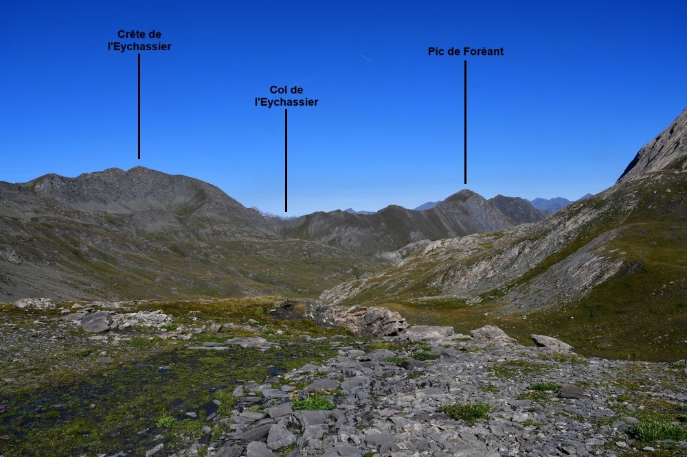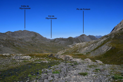 La crête de l'Eychassier et le pic de Foréant sont observés du col Vieux et de la Brèche de Ruine, donc vus depuis l'est-sud-est à une distance de 2,4km pour le pic de Foréant.