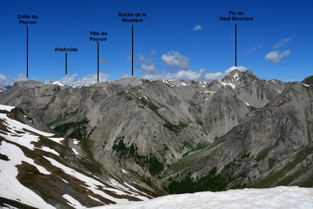 La crête du Peyron est observée depuis la Croix de Ratier, donc vue de l'est-sud-est à une distance de 3,9km.