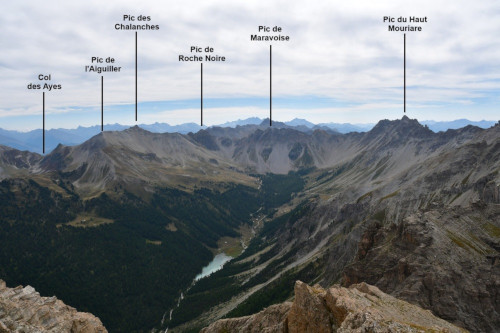 De ce belvédère, on aperçoit le pic de Beaudois, le pic des Chalanches, le pic de Maravoise, le pic du Haut Mouriare et le pic de Peyre Eyraute.