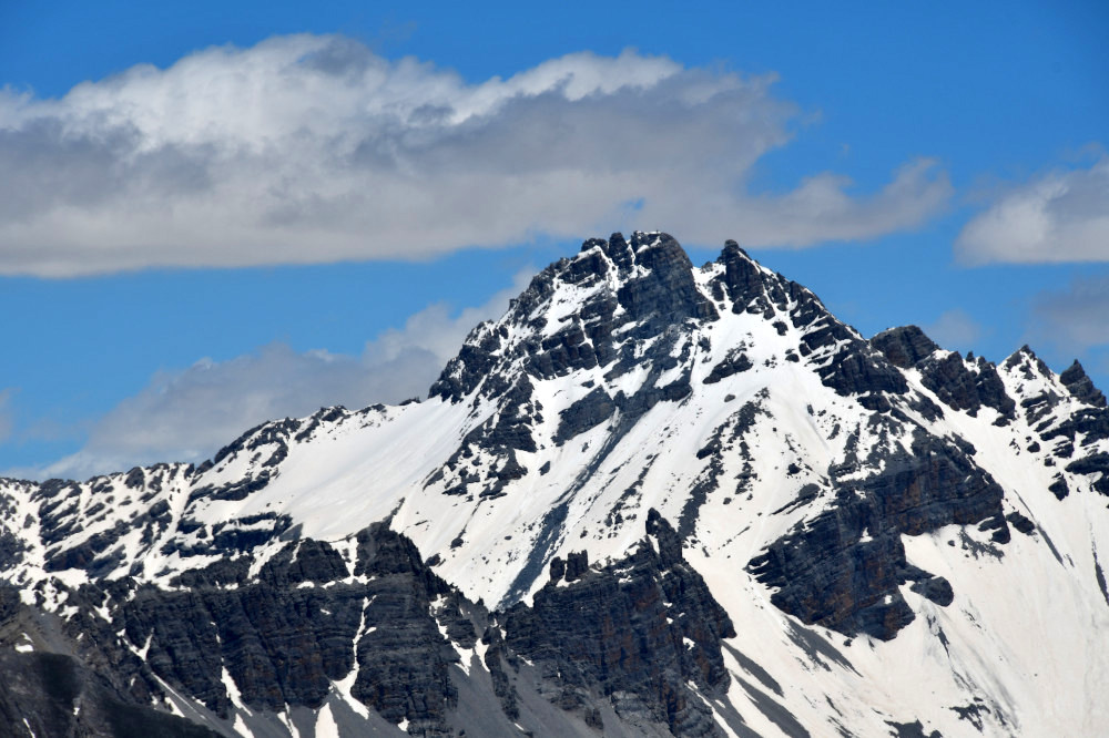 Le Pic de Rochebrune est observé depuis le sommet du pic des Esparges Fines, donc vu de l'ouest-sud-ouest à une distance de 10,2km.