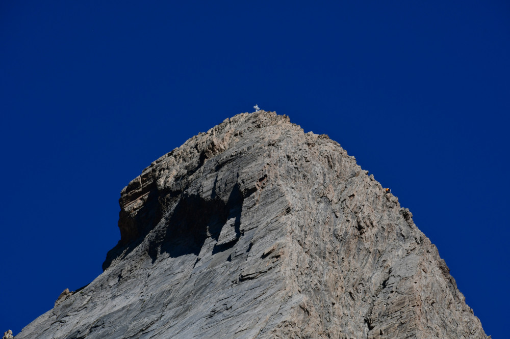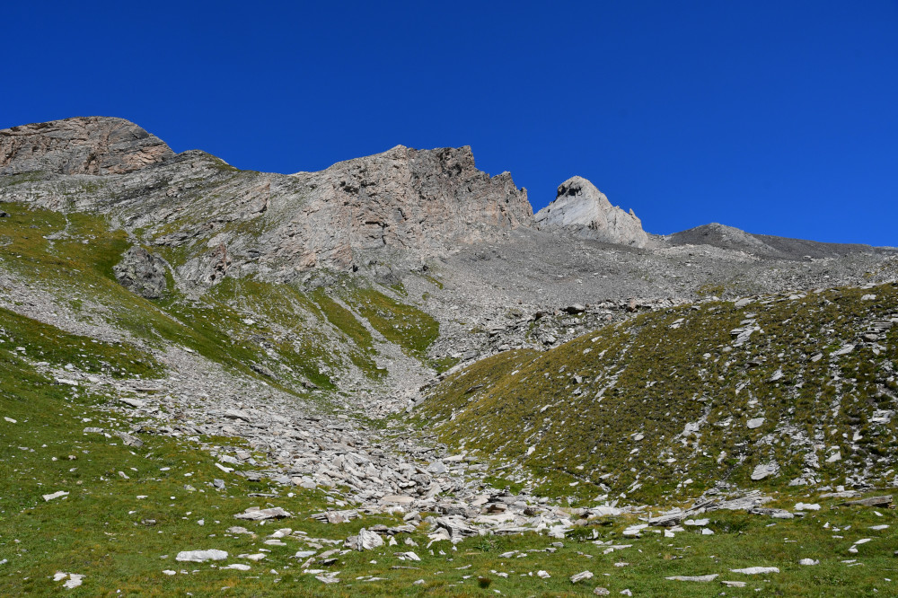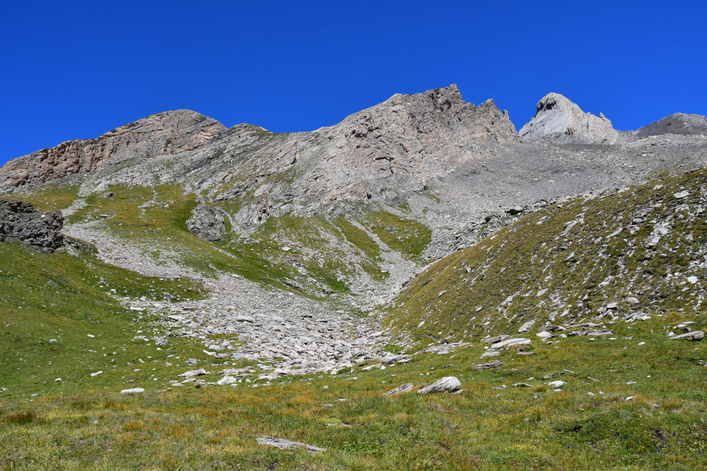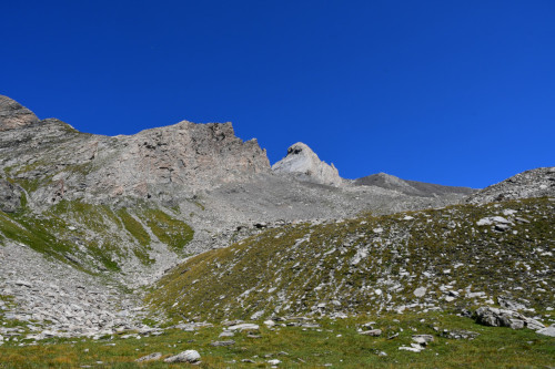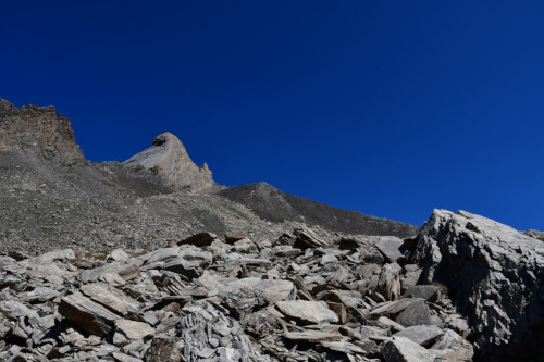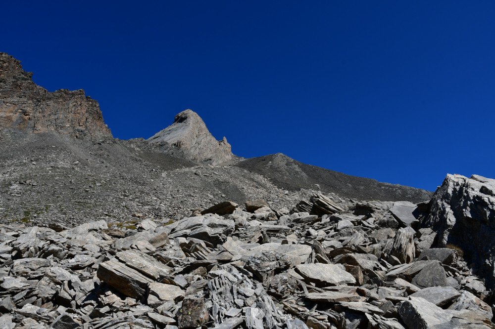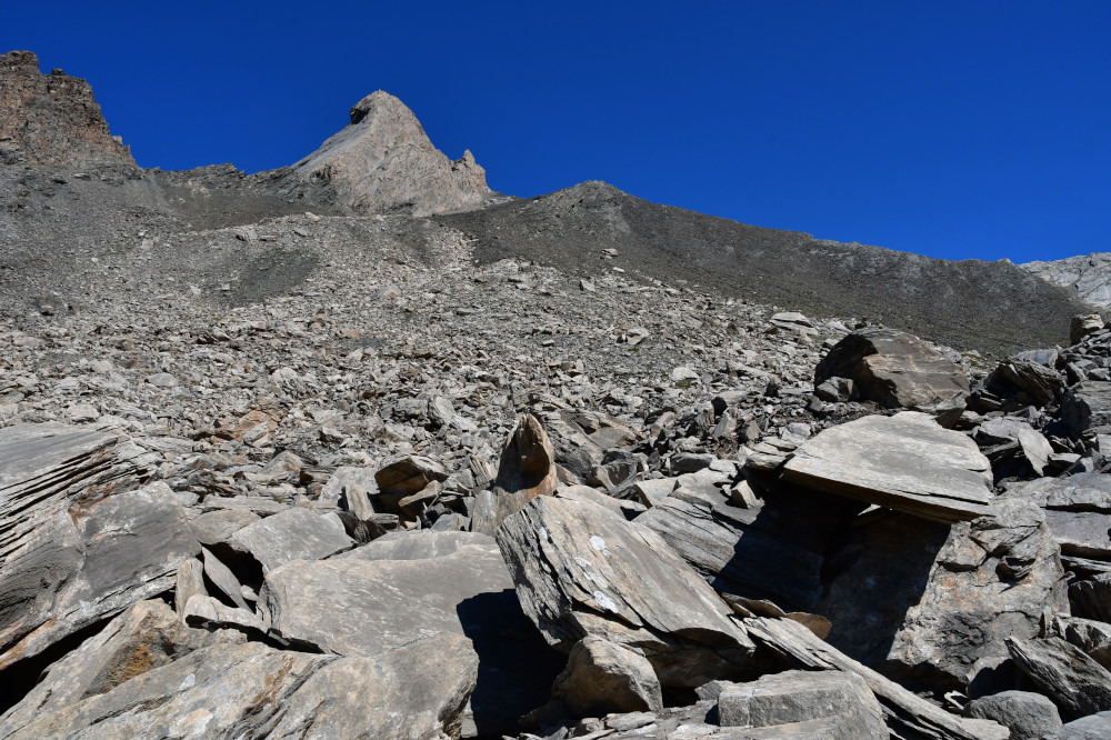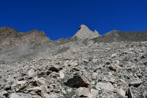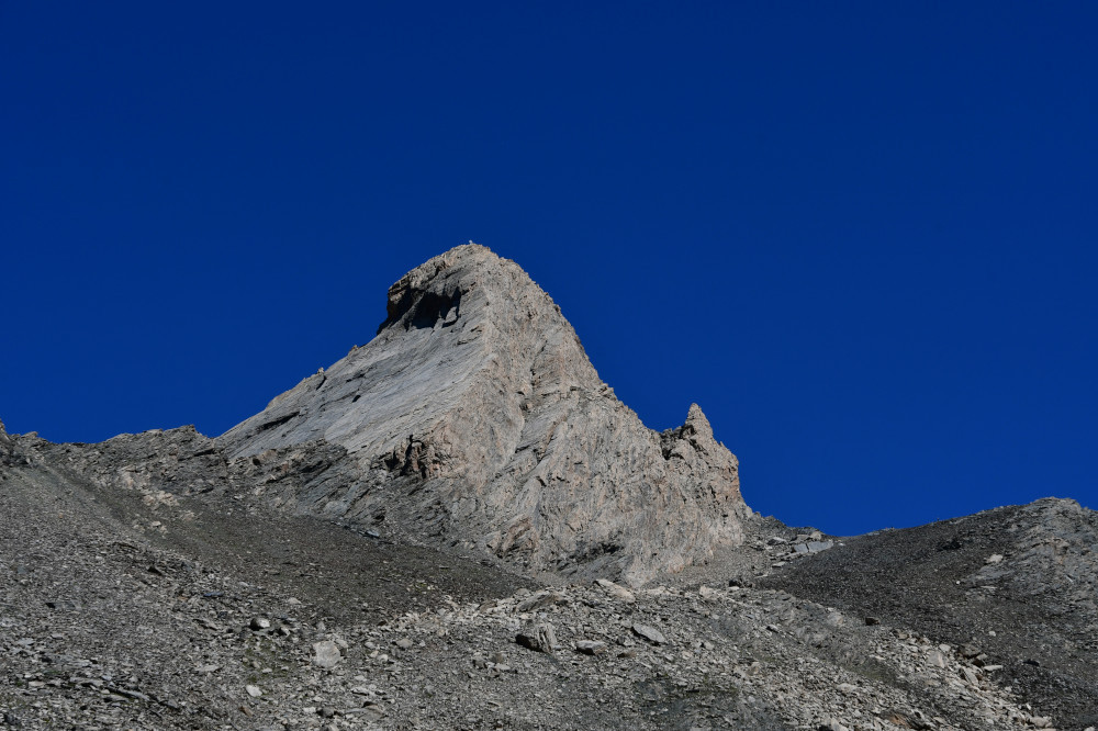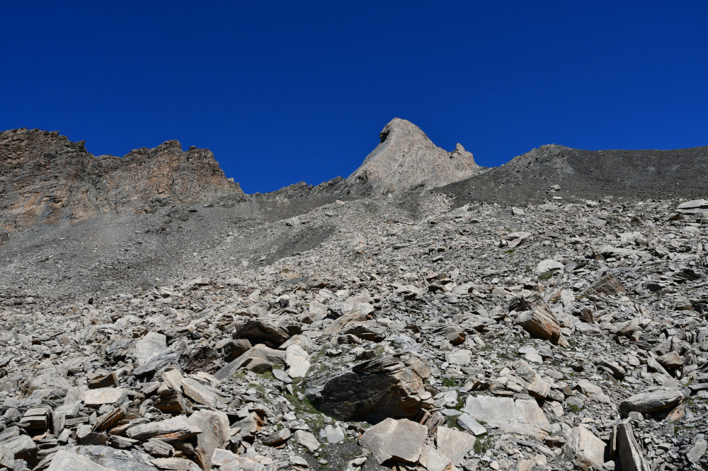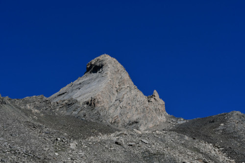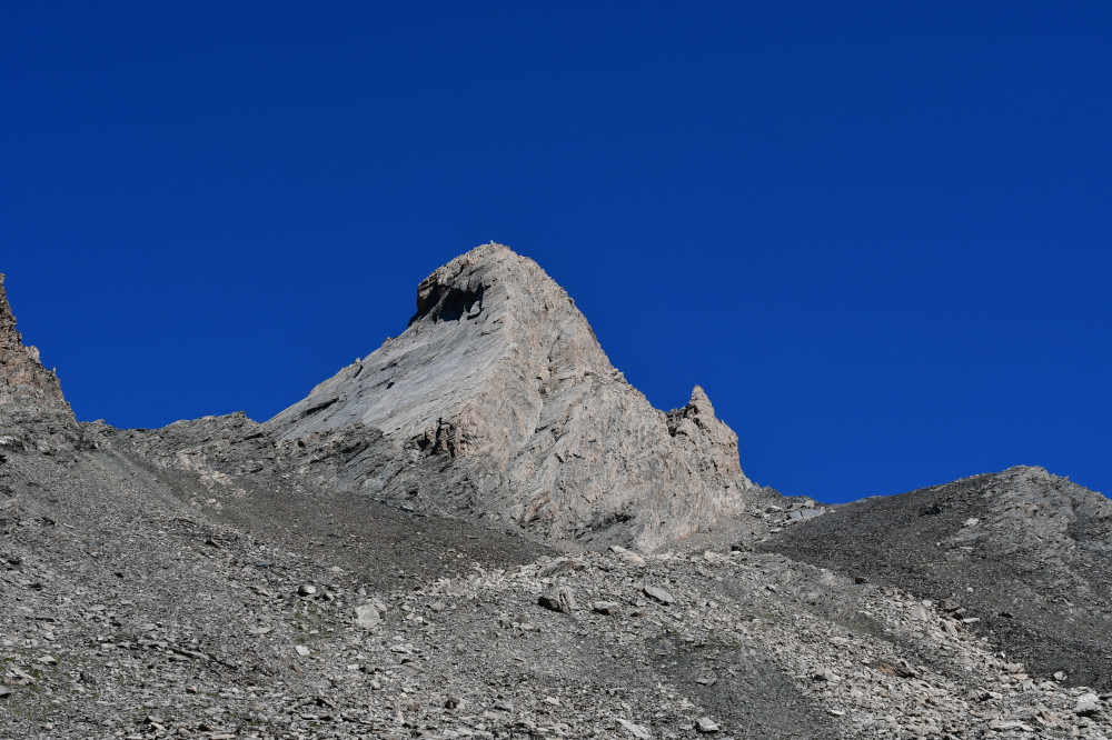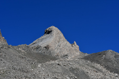 Le pic d'Asti est observé depuis le vallon Del Giarus lors de la montée au col d'Asti, donc vu du sud-ouest à une distance de 800m.
