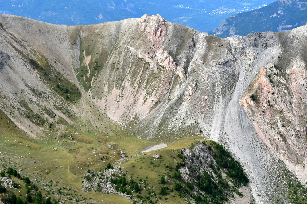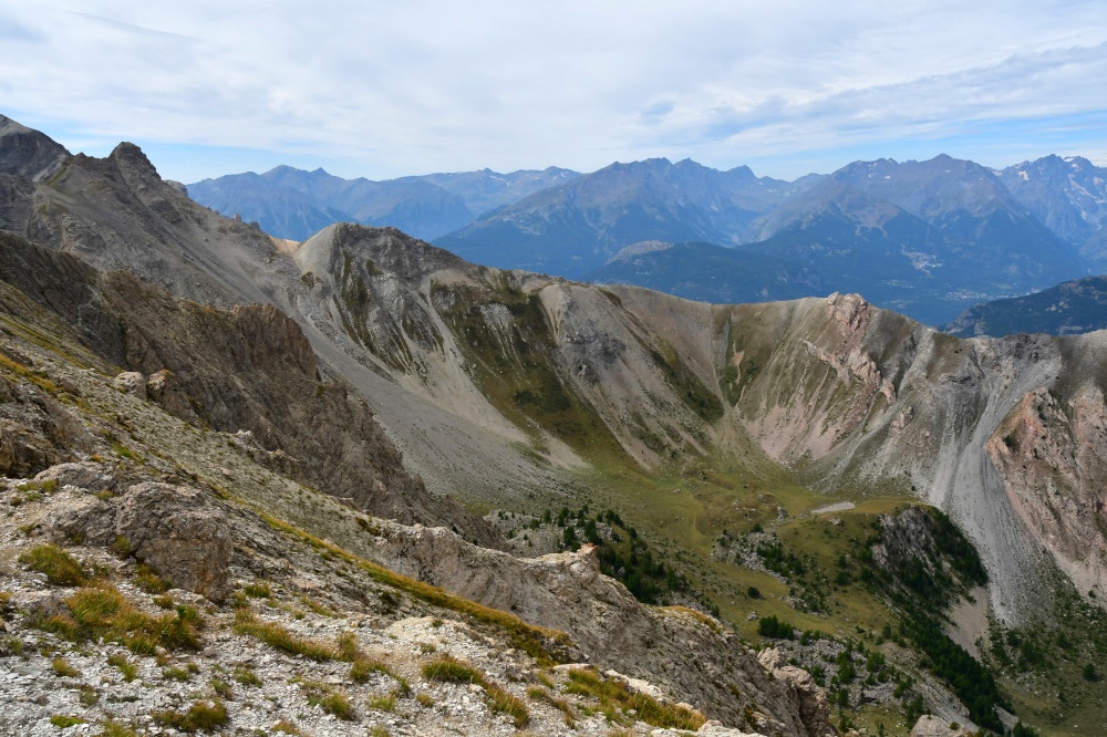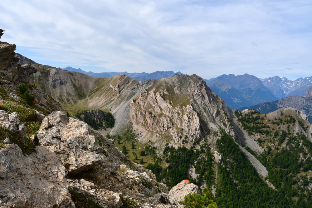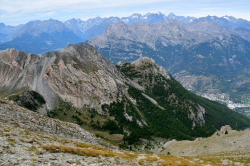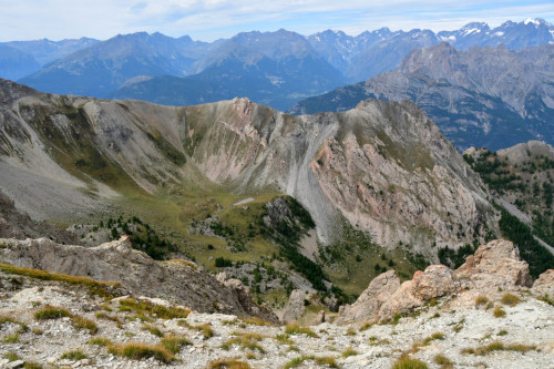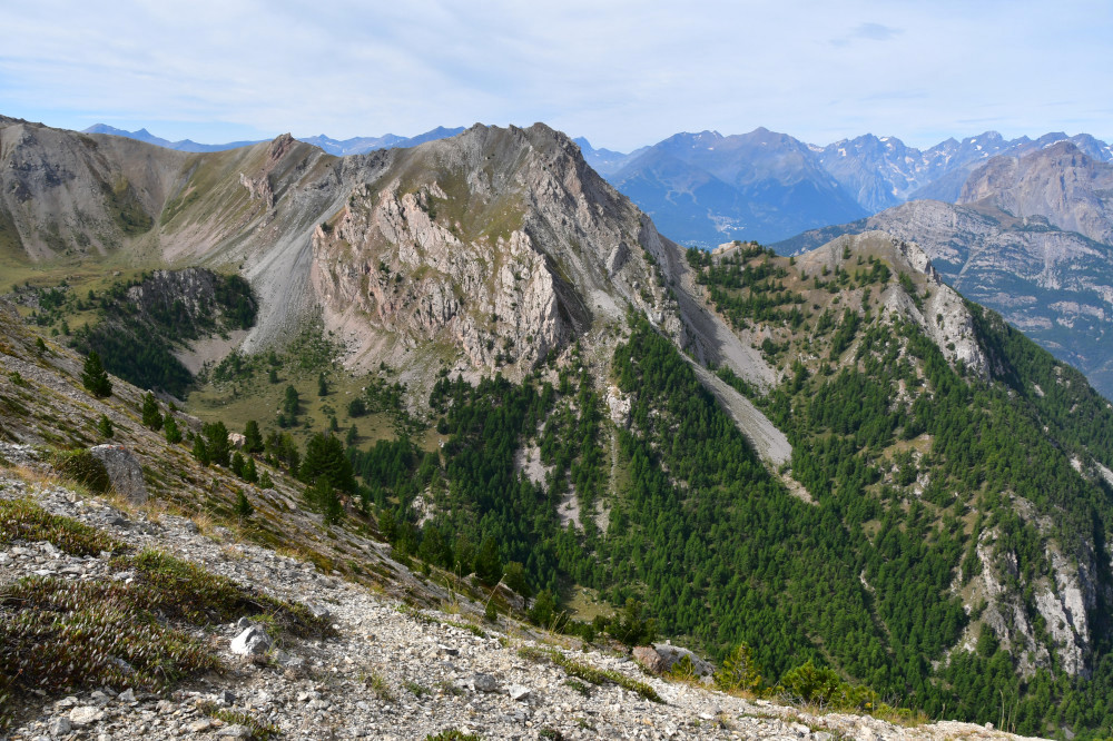Dans la même direction, en arrière plan, on aperçoit la tête d'Aval, le pic de Montbrison et la cime de la Condamine.