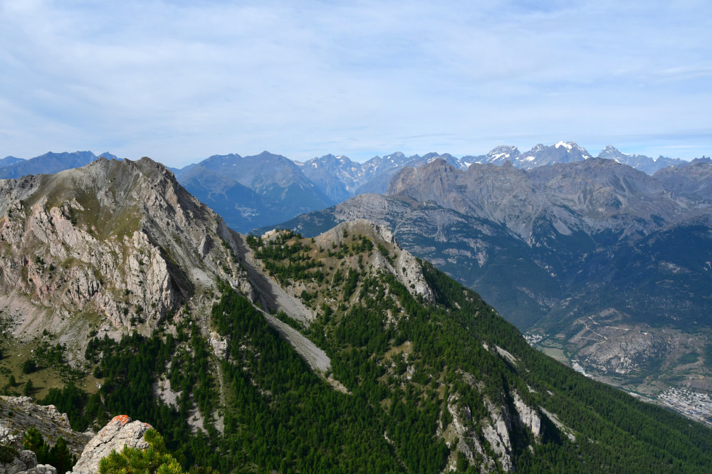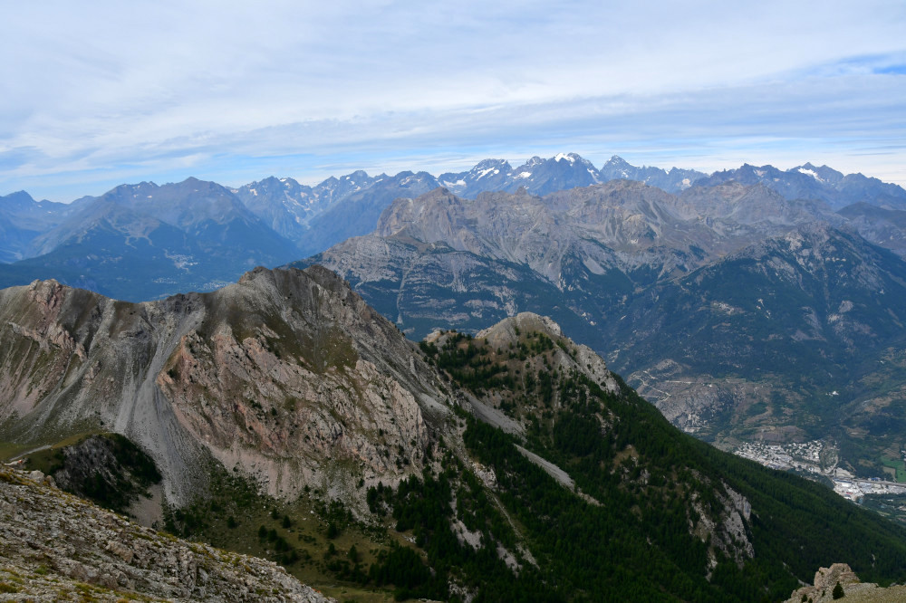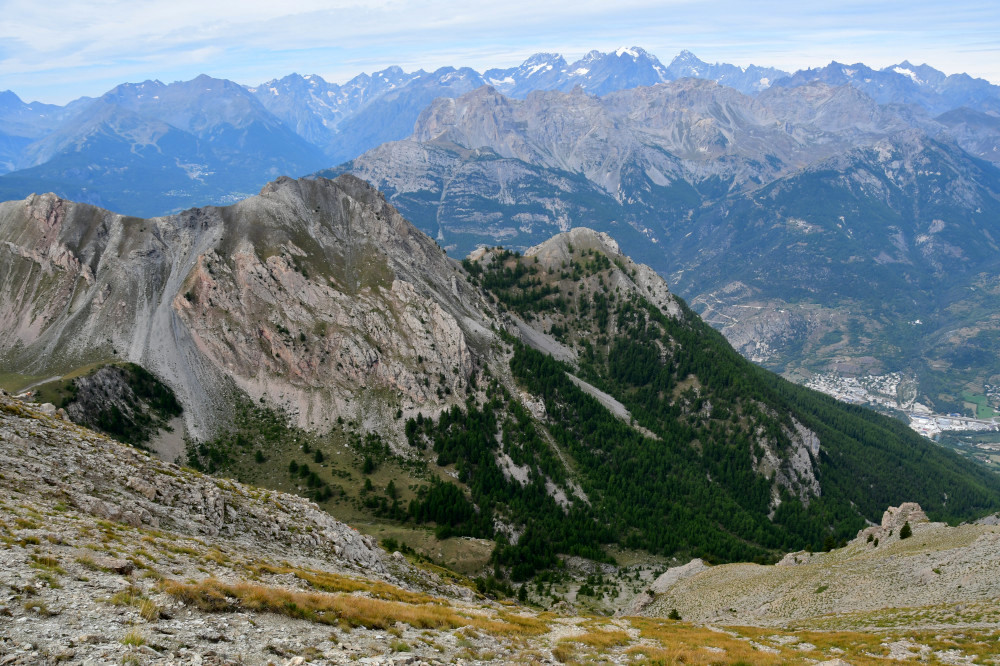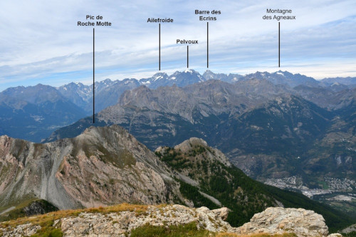 Au second plan, dans le massif des Ecrins, on peut voir l'Ailefroide, le Pelvoux, la Barre des Ecrins et la Montagne des Agneaux.