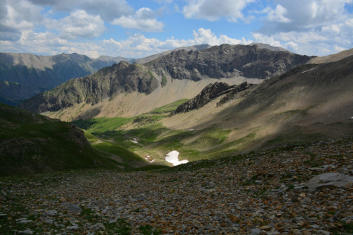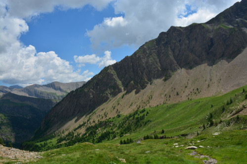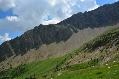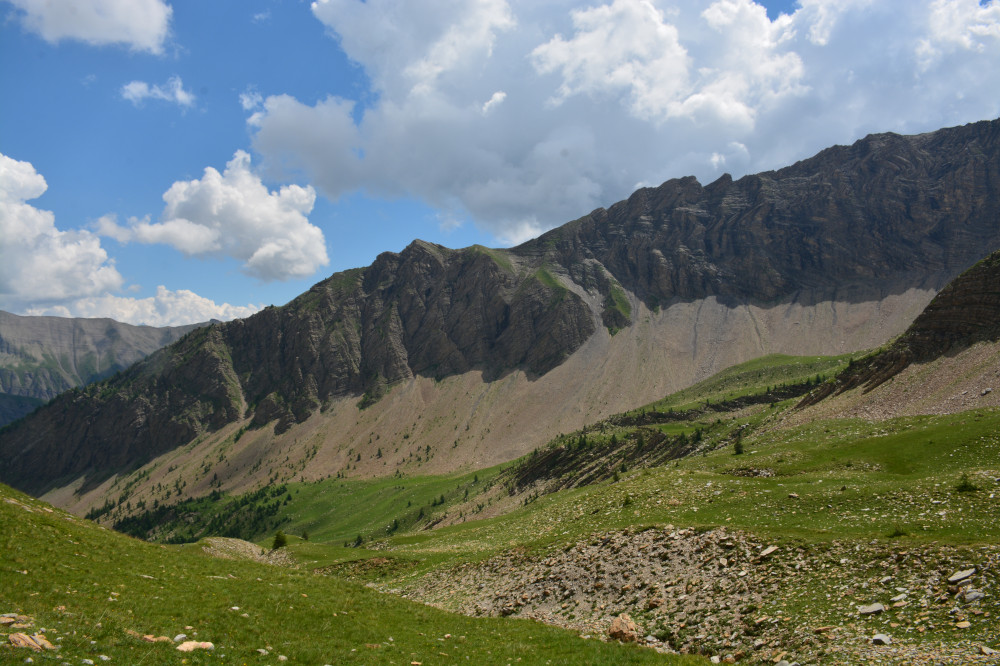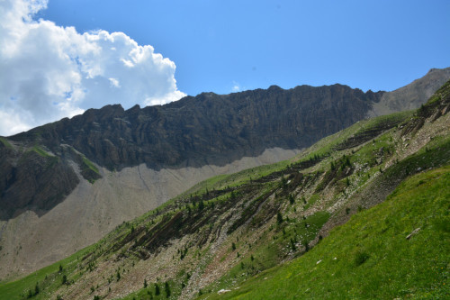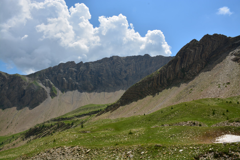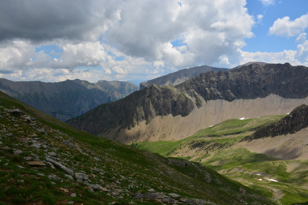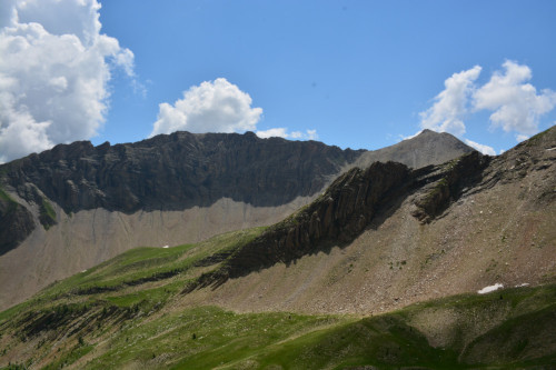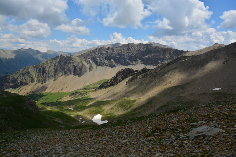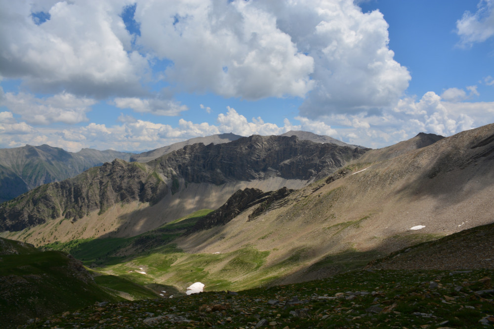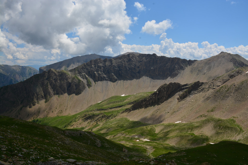 La tête de la Cabane et la tête du Tissap sont observées depuis le vallon du Tissap, donc vue de l'ouest à une distance de 1,8km.