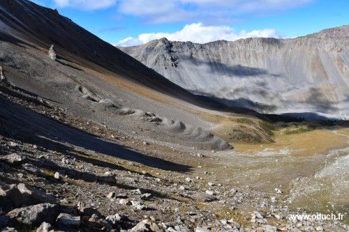 Au col, le sentier disparait. La descente se fait en suivant les traces laissées par les moutons. Ils suivent la pente la moins raide pour atteindre leur pâturage en contrebas. Un peu avant le point 2501, débuter une grande courbe vers la gauche (ouest). Passer près de ce qui ressemble fort à un glacier rocheux. Poursuivre la descente en direction de l'ouest en suivant plus ou moins le tracé d'un ruisseau. Vers la cote 2350, la pente est moins raide, débuter votre parcours en direction du sud-ouest. Au loin, le col de Dormillouse devient visible. Rattraper le sentier du GR5 au fond du vallon de l'Opon. Grimper vers le col en direction du nord. Atteindre le col de Dormillouse.