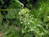 Les fleurs sont petites et blanches, disposées en grappes. Pétales un peu rougeâtres longs de 1.5 à 2 mm, de longueurs équivalentes aux sépales (contrairement à Capsella rubella, à pétales blancs longs de 2 à 3 mm et environ 2 fois plus longs que les sépales).
