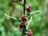 Fleurs d'un rouge foncé, assez petites, un peu odorantes, penchées, en grappe unilatérale assez serrée ; bractées toutes plus courtes que les fleurs ou les inférieures un peu plus longues ; périanthe peu ouvert, à divisions un peu aiguës, dépassant le labelle ; Labelle à gibbosités plissées-crépues, à languette ovale-aiguë recourbée au sommet. L'éperon est nul.