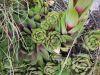 Rosettes aplaties, grandes, 5 à 8 cm de diamètre. Tige florifère dressée, robuste.