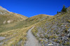 Piste, puis sentier en direction du col. Hors sentier entre la cabane de berger et la ligne de crête