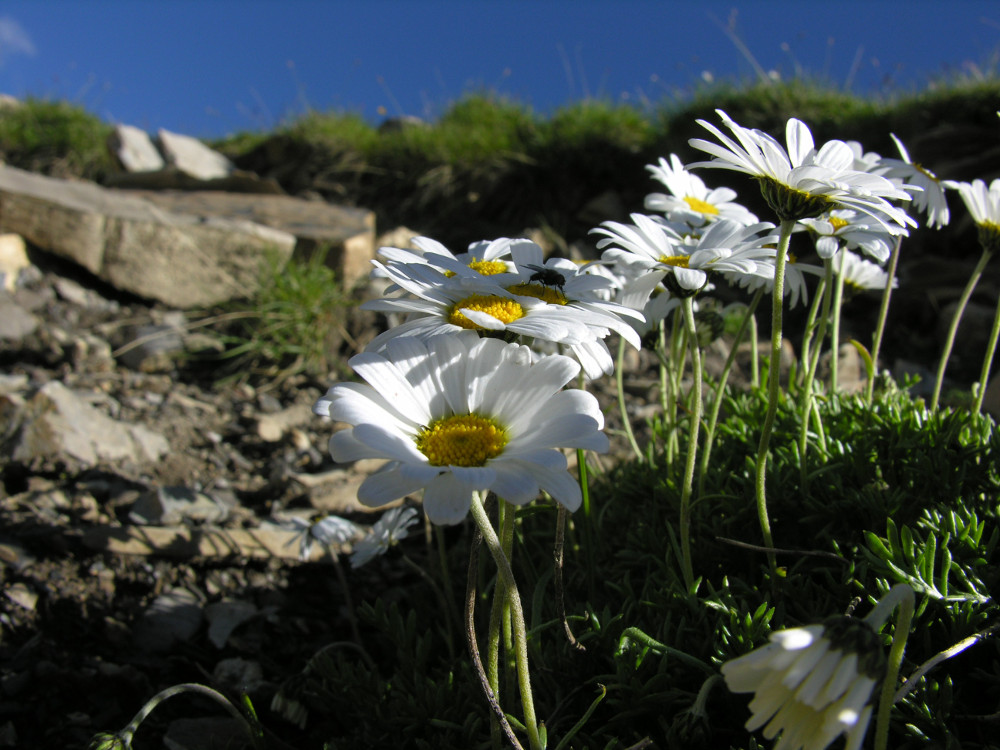 Fleurs en capitules solitaires de 20-40 mm de diamètre ; bractées de l’involucre toutes obtuses, à marges brunes ; ligules blanches devenant souvent rosées ; fleurons jaunes, à tube cylindracé.