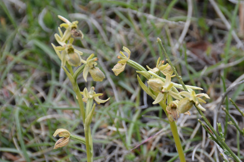 Fleurs 2-10. Les 3 tépales extérieurs ovales-lancéolés, longs de 8-12 mm, étalés, vert jaunâtre ; les 2intérieurs plus étroits, longs de 4-8 mm, étalés, à bords ondulés, tronqués à l'extrémité, vert olive à rougeâtres. Labelle entier, long seulement de 5-9 mm, parfois échancré, convexe à l'avant, brun foncé,bord jaune verdâtre bien marqué, velouté ; dessin glabre, bleuâtre, en forme de H ou de fer à cheval, généralement sans appendice. Eperon nul.