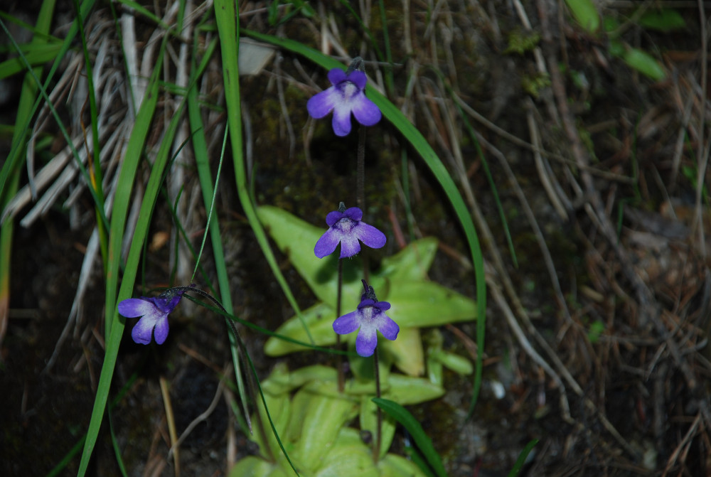 Fleur solitaire terminale, penchée à l’extrémité d’un long pédoncule grêle, glabre ou pubescent ; calice glanduleux à lobes oblongs, les supérieurs pas plus longs que larges ; corolle violette, généralement blanche à la gorge, longue de 13 à 30 mm, à 5 lobes plus longs que larges, non contigus et divergents, formant 2 lèvres très inégales, l’inférieure prolongée en éperon grêle, égalant le tiers ou la moitié de la corolle.