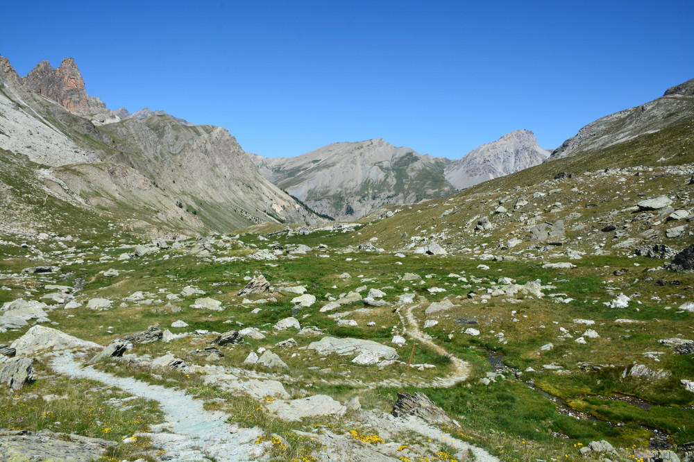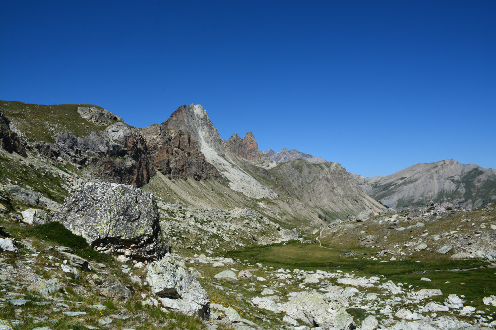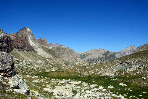 L'Aiguille Large est photographiée depuis le vallon de Mary, donc vue du sud-est. Au delà de ce sommet, on aperçoit les pics de la Font Sancte et, plus à l'est, la Tête de Girardin.