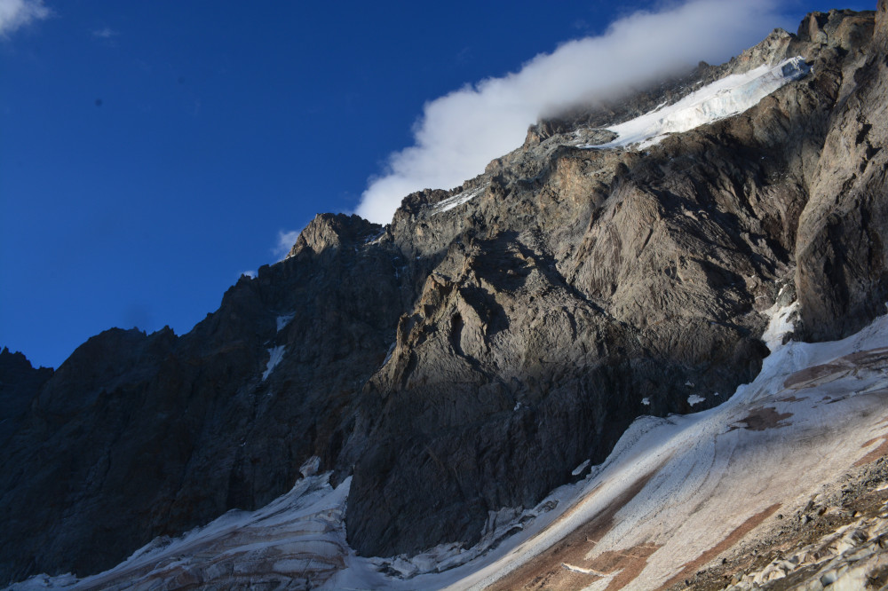 L'Ailefroide et son glacier suspendu sont observés depuis le glacier Noir lors de la montée vers le pic Coolidge, donc vus du nord à une distance de 850 m pour le sommet Orientale.