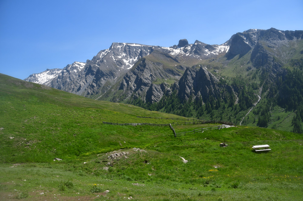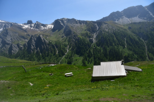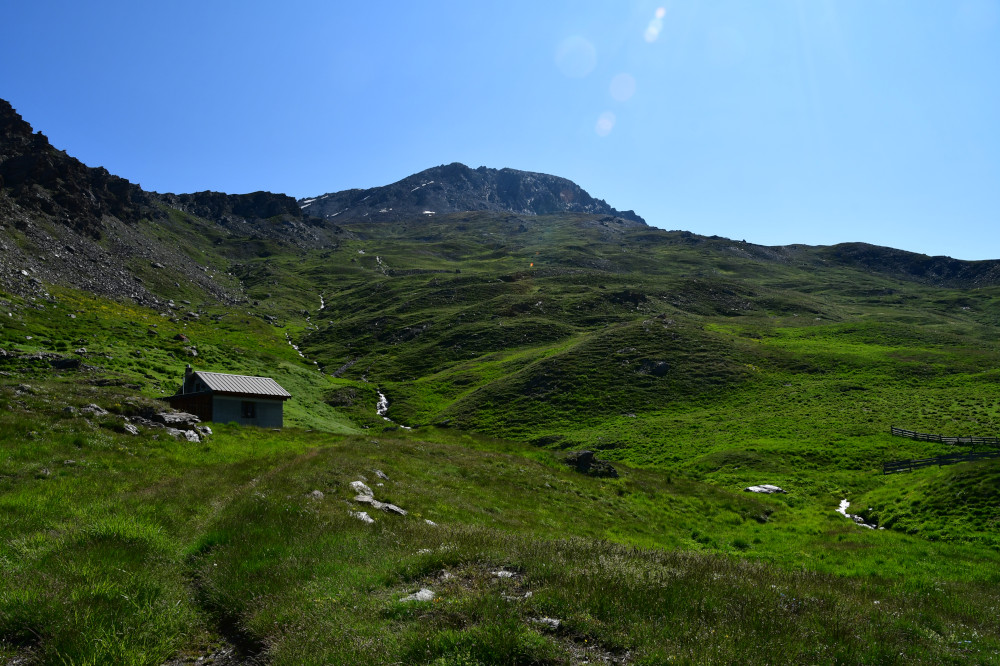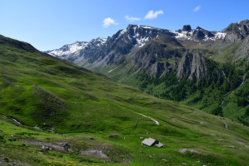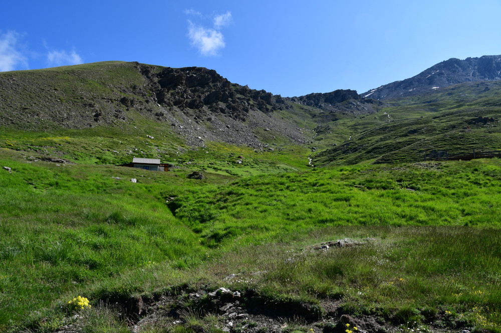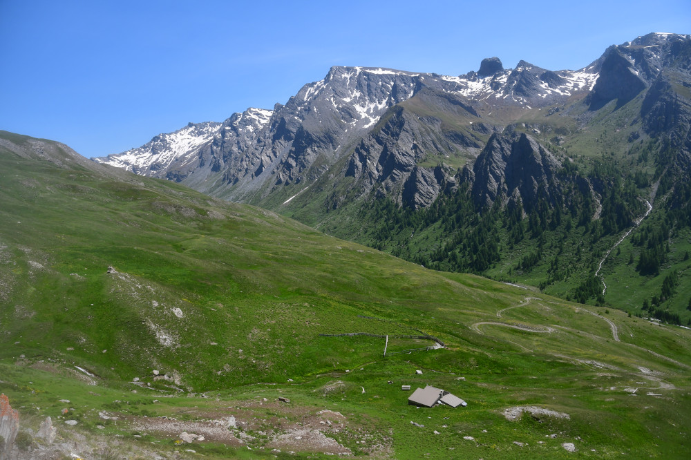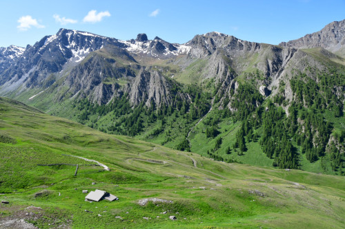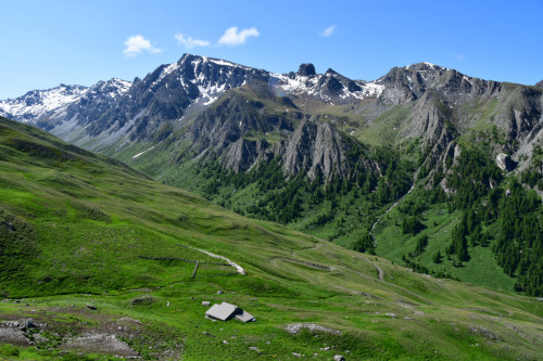 La cabane de Berger se situe sous la crête de Roche Rousse et sous le haut sommet du Grand Queyras plus à l'est.