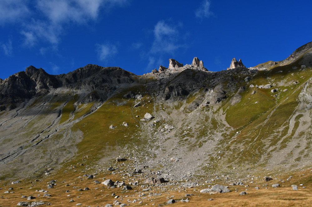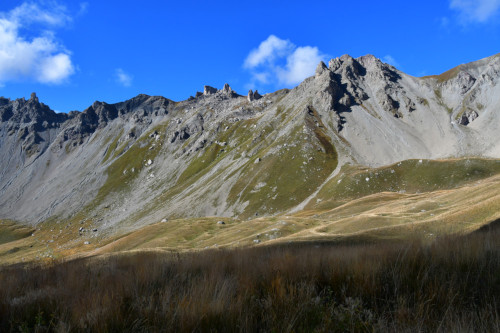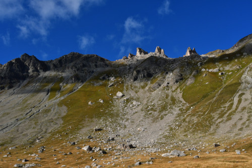 La crête des Pénitents et le Roc de Serre Chapelle sont observés depuis les chalets de l'Orcière, donc vus de l'est à une distance de 930 m pour le Roc de Serre Chapelle.