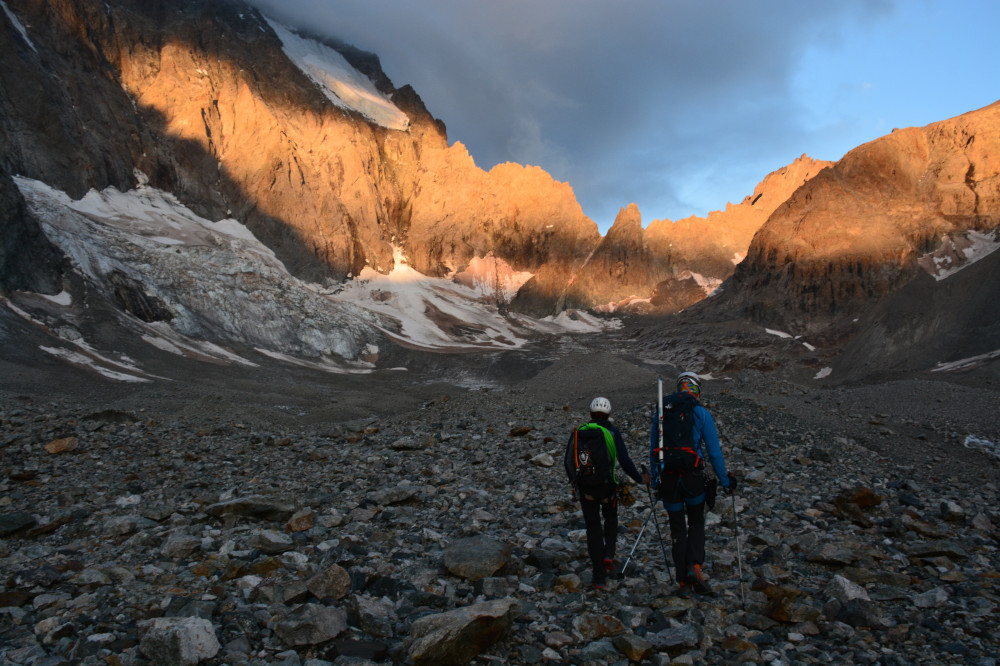 Les Dents de Coste Rouge sont observées depuis le glacier Noir lors de la montée vers le pic Coolidge, donc vues du nord-est à une distance de 660 m.