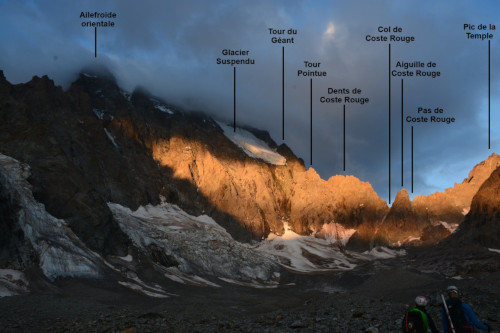 De part et d'autre de ce sommet, on aperçoit vers la gauche la Tour du Géant et la Tour Pointue. Vers la droite, on distingue l'Aiguille de Coste Rouge et le Pic de la Temple.