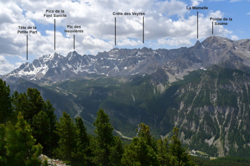Les pics de la Font Sancte et la pointe des la Saume sont observées depuis la crête des Eysselières, donc vues nord à une distance de 6,2km.