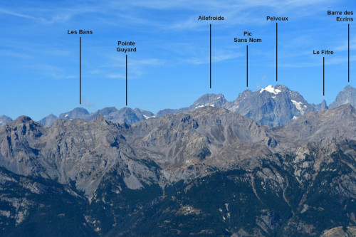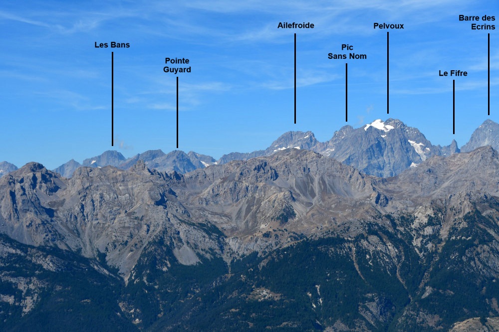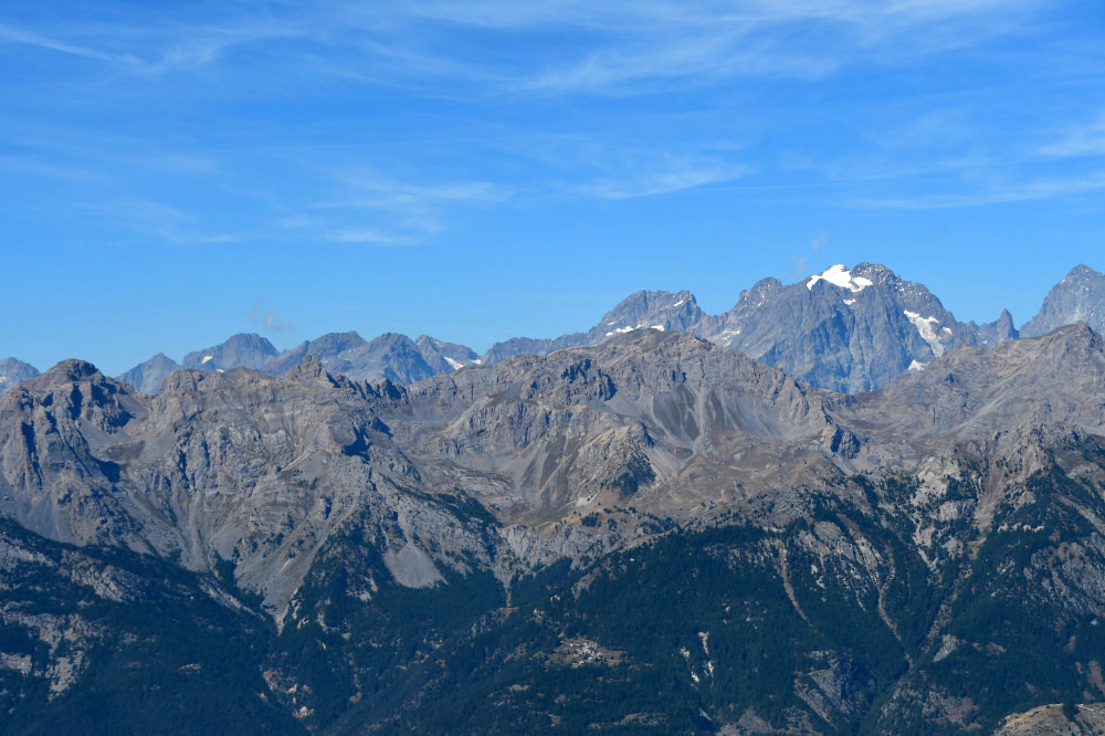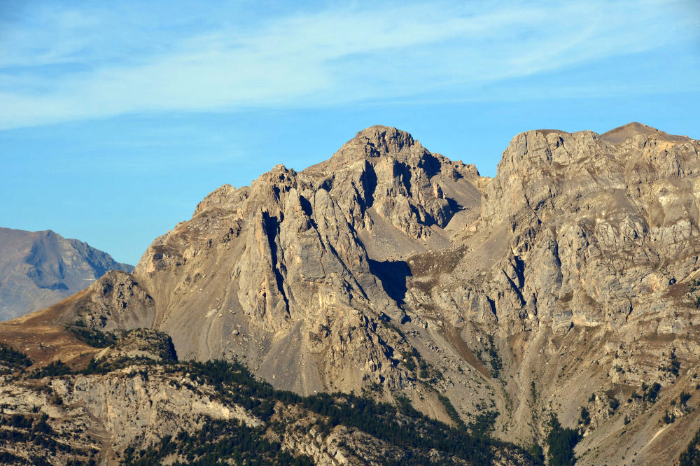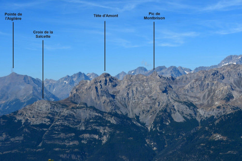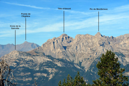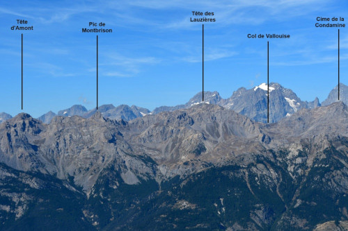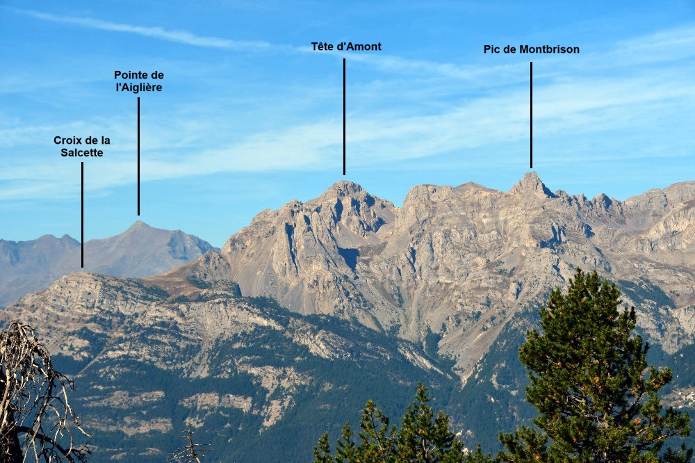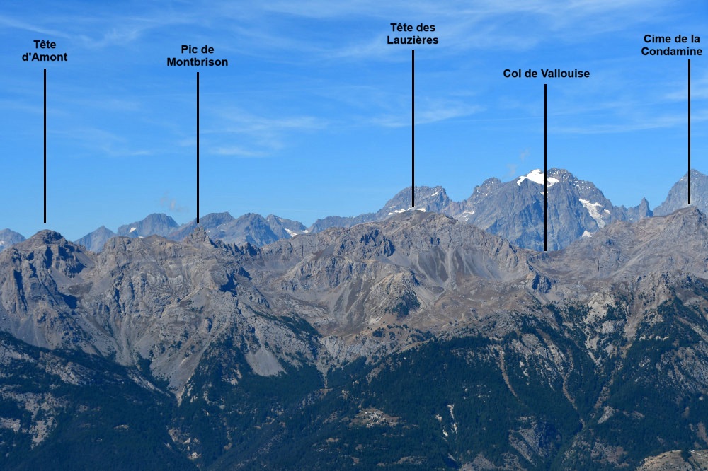 La Tête d'Amont et le Pic de Montbrison sont observés depuis l'ancien Fort de la Grande Maye, donc vus de l'est à une distance de 10,74km.