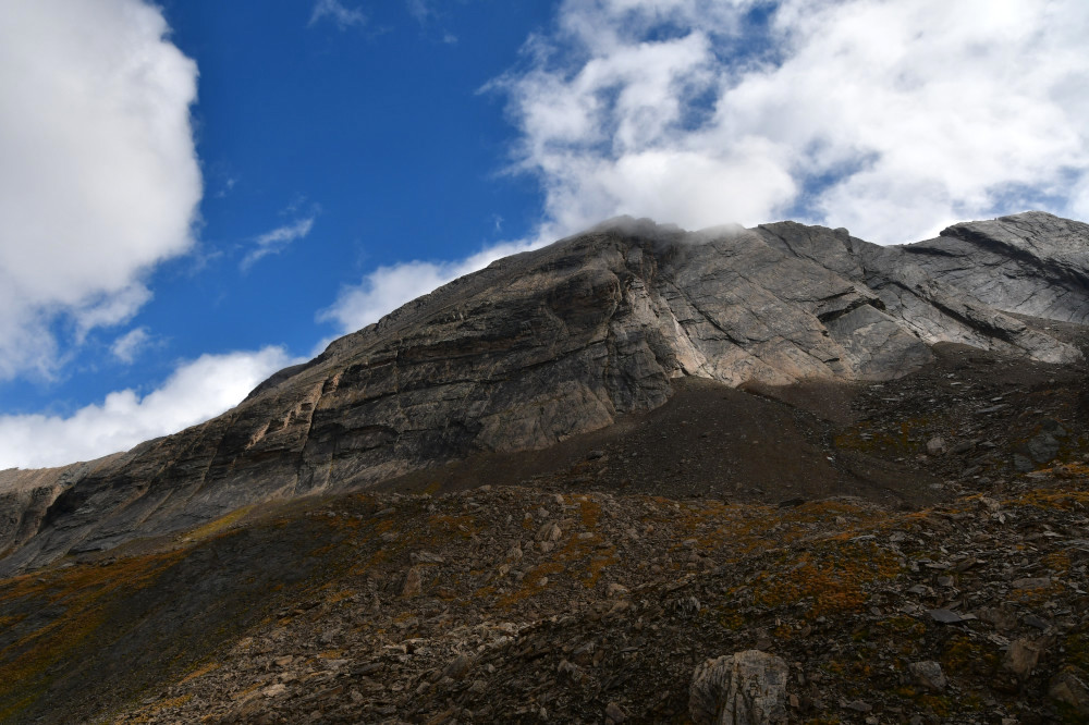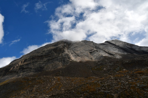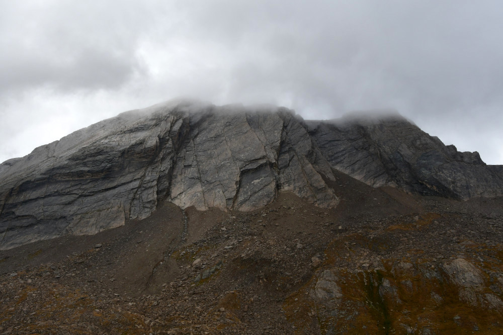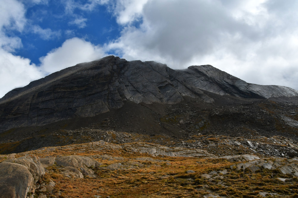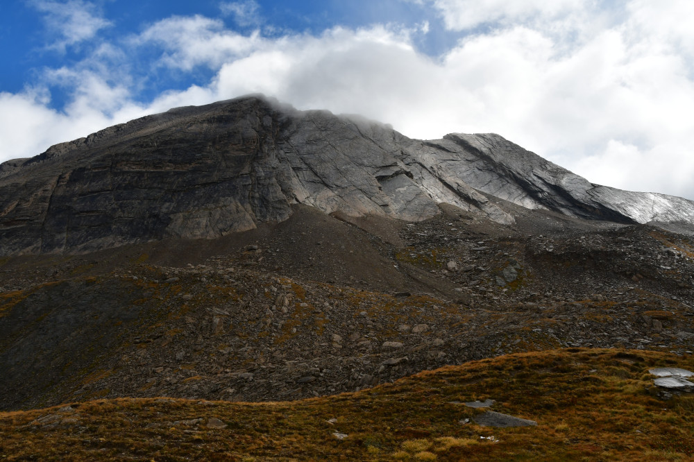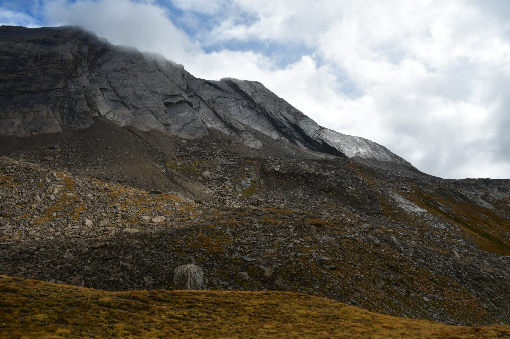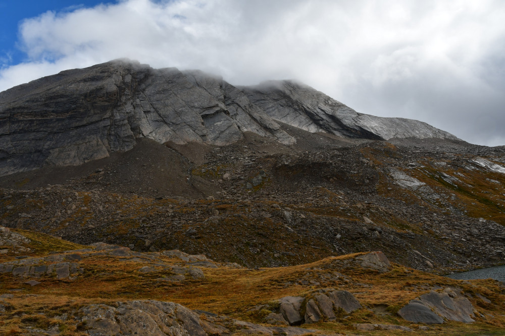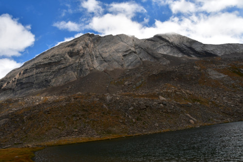 La crête de la Taillante est observée depuis le lac Foréant, donc vue de l'ouest-sud-ouest à une distance de 890 m pour le point culminant à 3196 m.