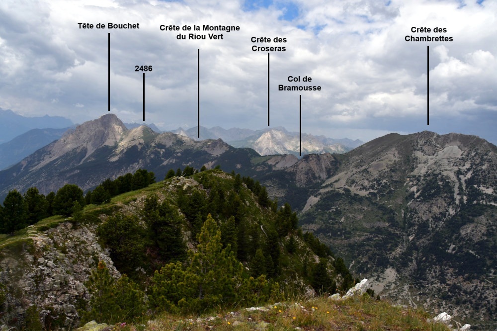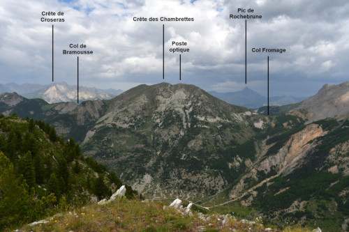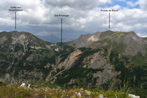 A l'ouest de cette crête, on peut apercevoir le col de Bramousse, tandis qu'à l'est, on trouve le col Fromage et la pointe de Rasis.