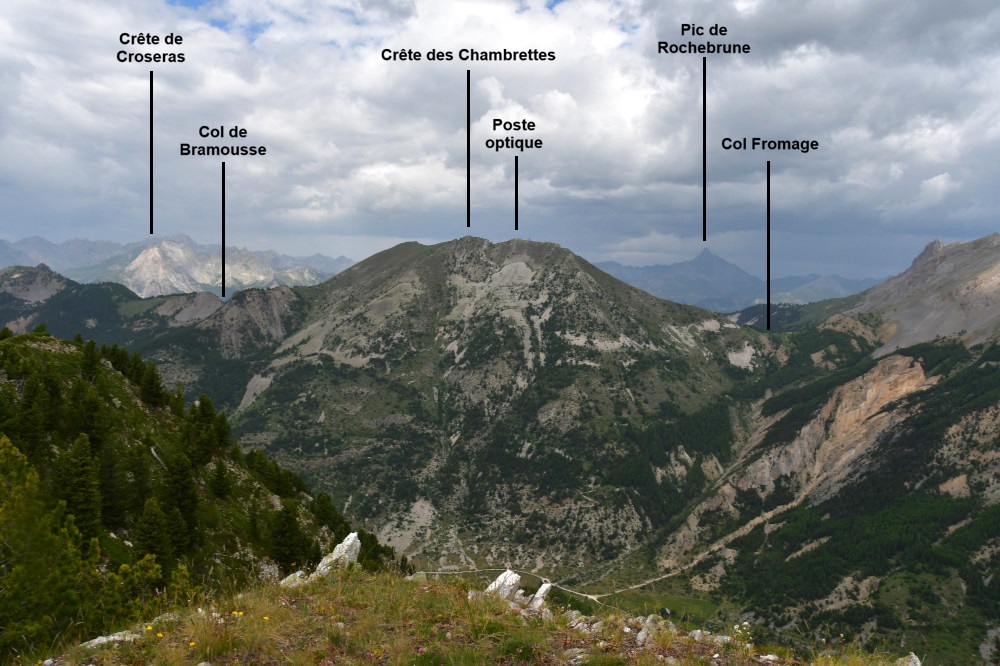La crête des Chambrettes est observée depuis la crête de l'Eysselières, donc vue du sud à une distance de 3,5 km.
