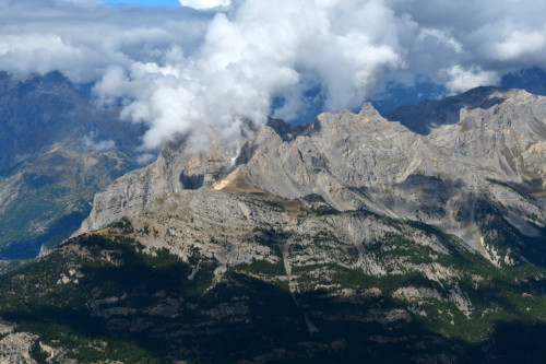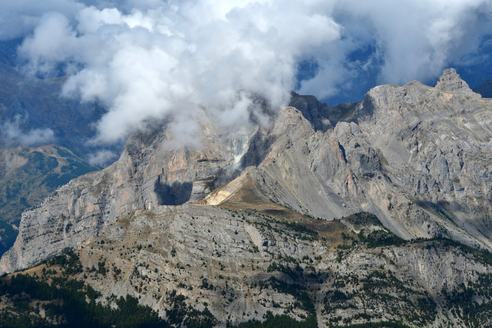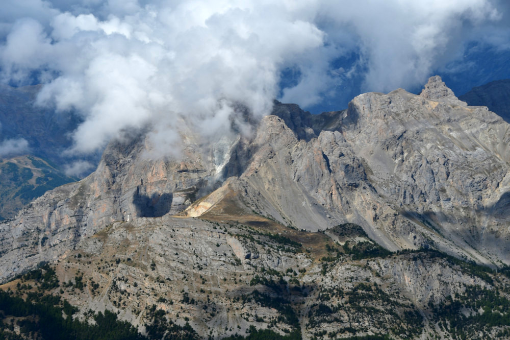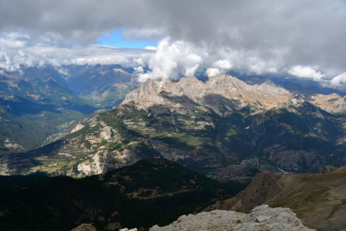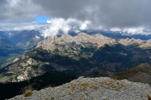 On aperçoit sur la gauche du Pic de Montbrison la Tête d'Amont et la Tête d'Aval. Sur la droite (nord), on voit la crête et la Tête des Lauzières.