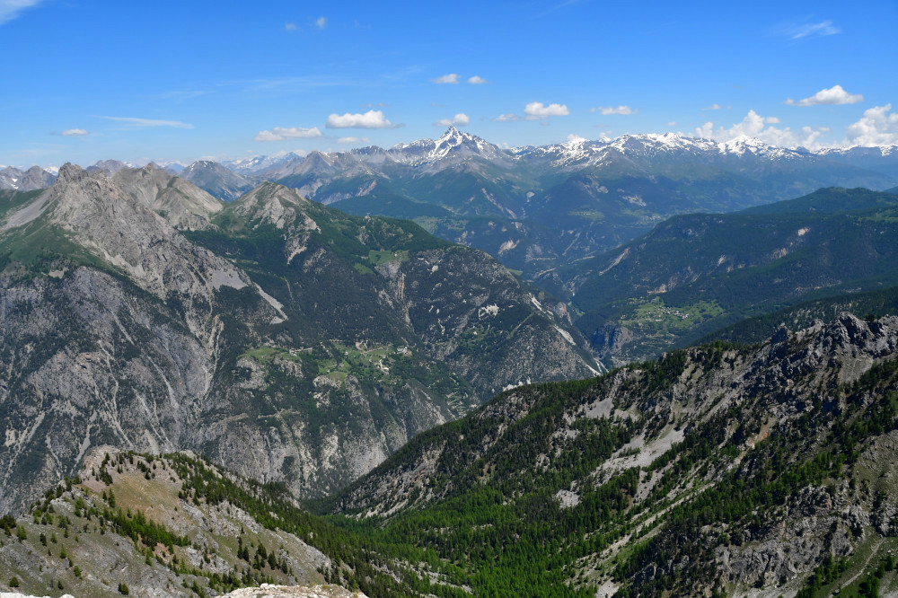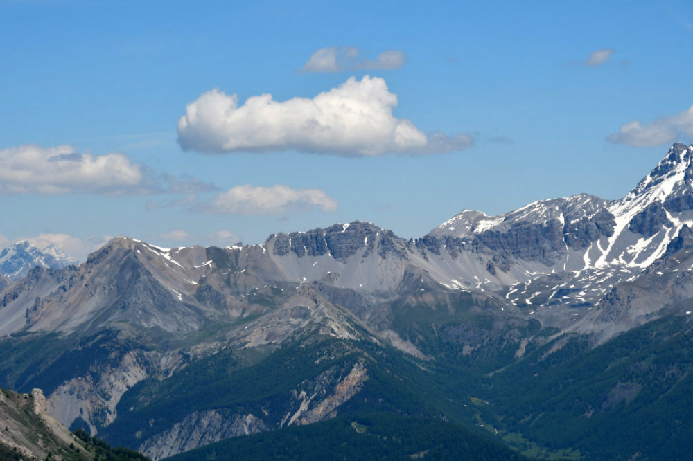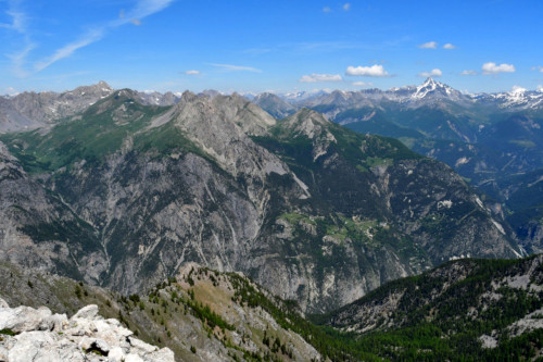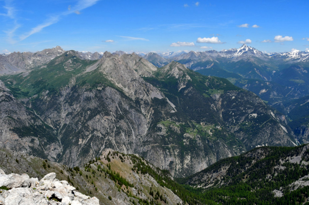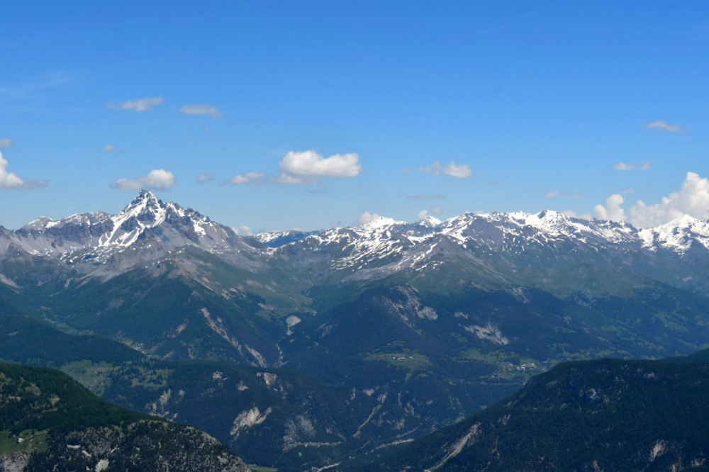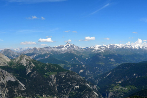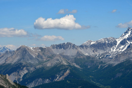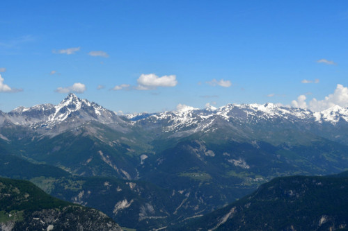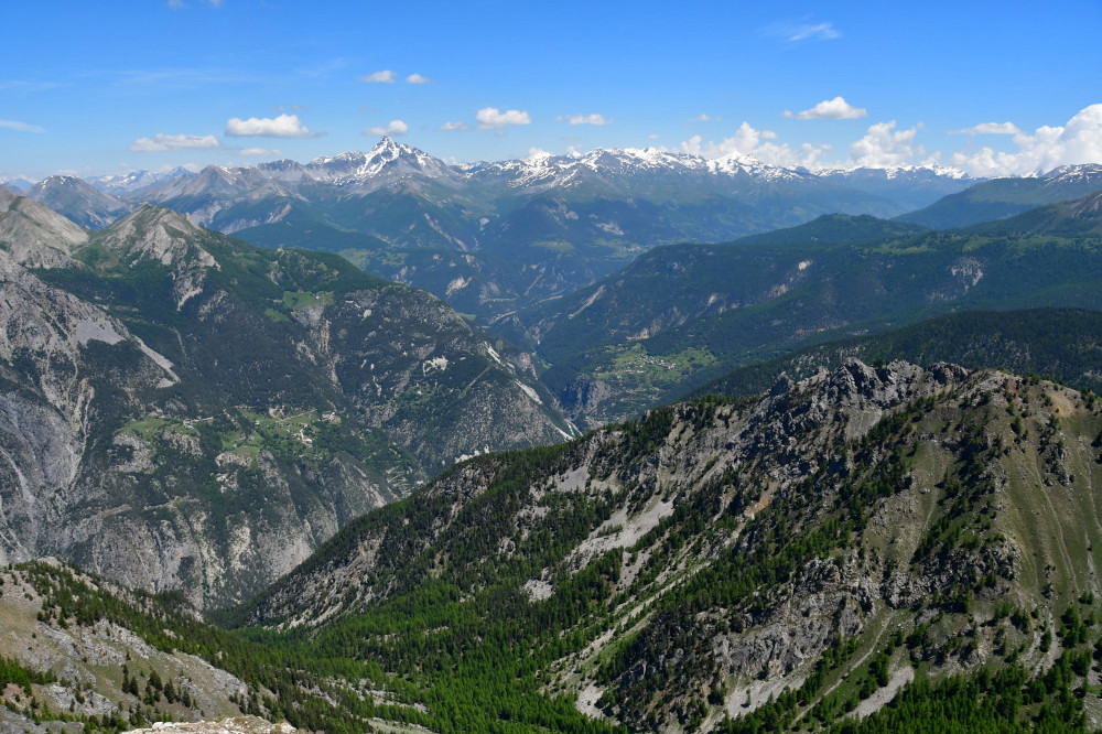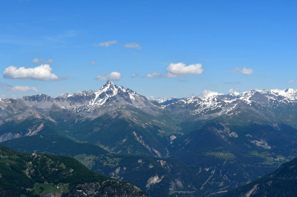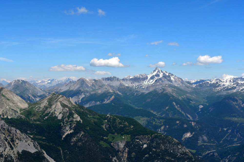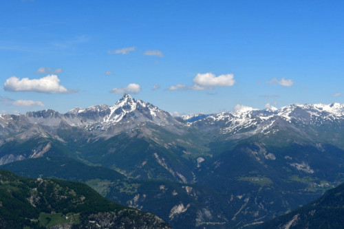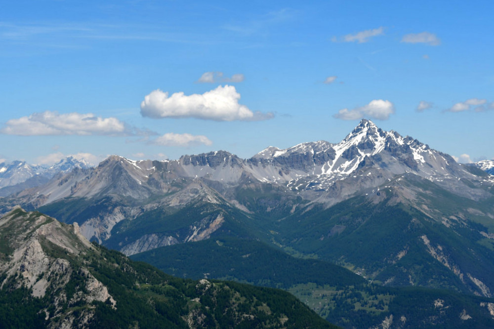 Le Pic de Rochebrune est observé depuis le sommet d'Assan, donc vu du sud à une distance de 15,8km.