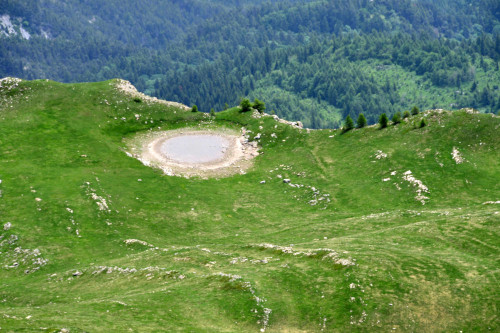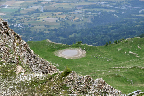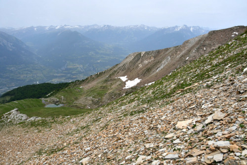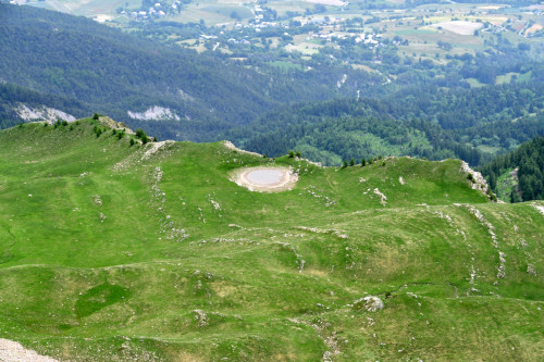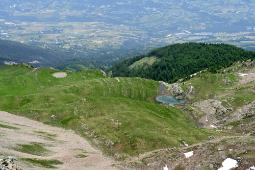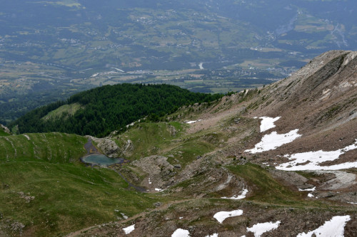 Le lac de l'Hivernet est observé depuis le sommet de la Tête de Chante-Perdrix, donc vu de l'ouest à une distance de 850 m.