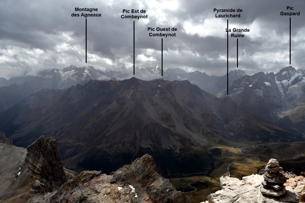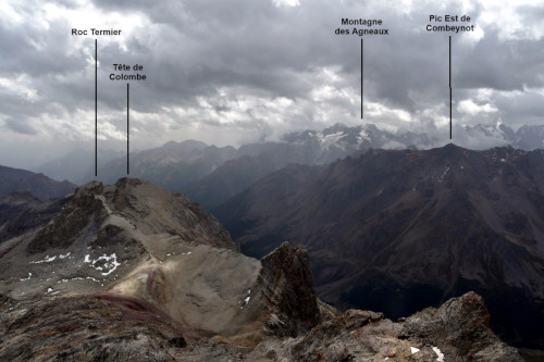 Les pics Est et Ouest de Combeynot sont observés depuis le sommet Est du Grand Galibier, donc vus du nord-nord-est à une distance de 6km.