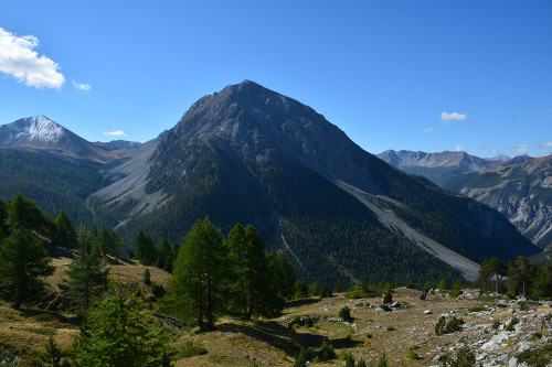 Le Pic du Lauzin est photographié depuis le col des Acles, donc depuis le nord. On l'observe au bout du vallon de l'Opon, à gauche des crêtes de Pécé et du col de Dormillouse. A sa gauche se trouvent le col des Trois Frères Mineurs et la Pointe des Rochers Charniers.,