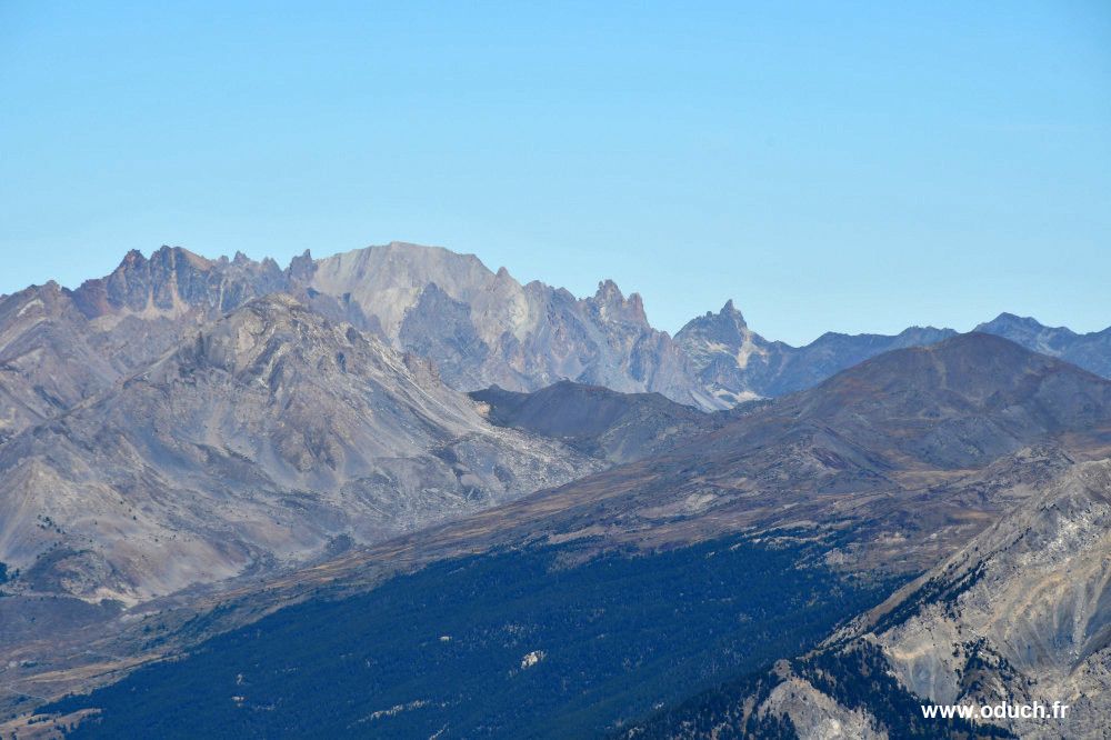 La pointe des Cerces et la Tête de la Cassille sont observées depuis le pic de Côte Belle, donc vues depuis le sud. Distance : 34,7 km pour la pointe des Cerces.