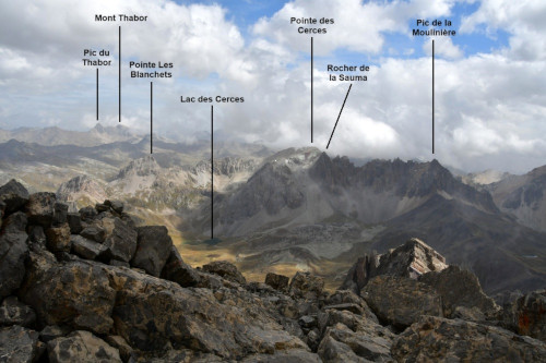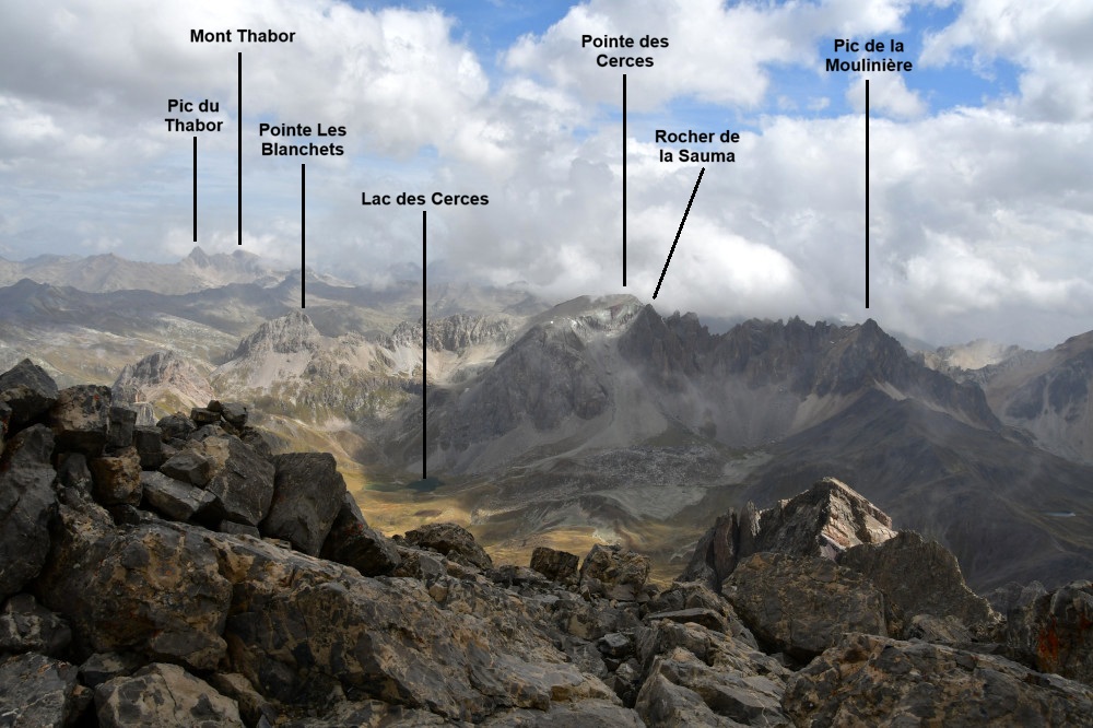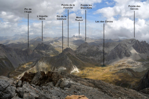 La Pointe des Cerces est observée depuis le sommet Est du Grand Galibier, donc vue de l'ouest à une distance de 3,9km.