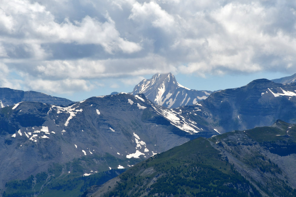 Les hauts sommets de l'Embrunais sont observés depuis le sommet de la Mayt, donc vus depuis l'est-est-nord. Distance : 22 km.