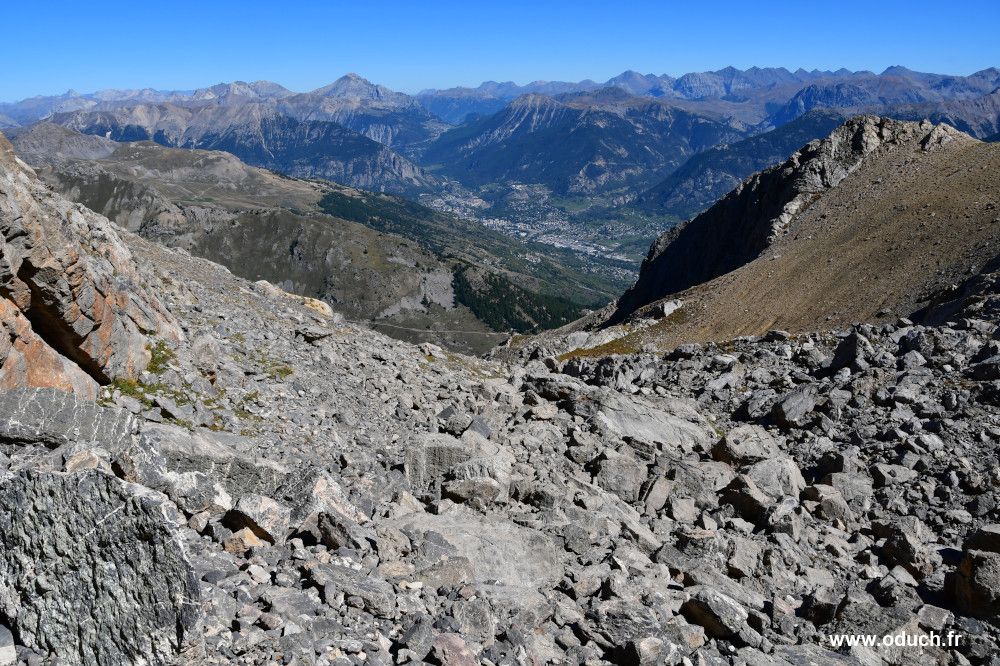 Reprendre la progression en direction de l'ouest, en grande partie dans les rochers, avec quelques passages dans des pierriers formés de très gros blocs. Remonter le petit cirque sous le Pas de Montbrison avant d'atteindre le point 2656.