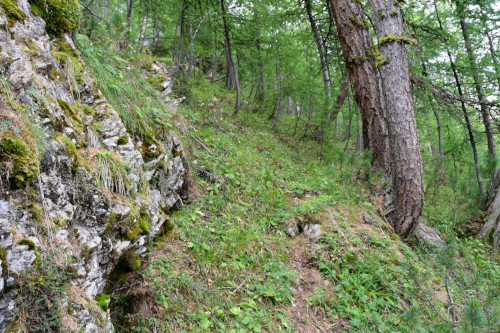 Grimper en cherchant une trace plus ou moins bien marqué entre les mélézes. Passer au pied d'un gros bloc rocheux en le contournant par la droite. Reprendre l'ascension en restant sur la croupe de la ligne de crête menant vers les sommets. Vers 2250 m, rejoindre le vallon d'un petit torrent. Remonter ce vallon en réalisant des petits lacets. Après 150 mètres, prendre à l'azimut vers la sortie du bois.