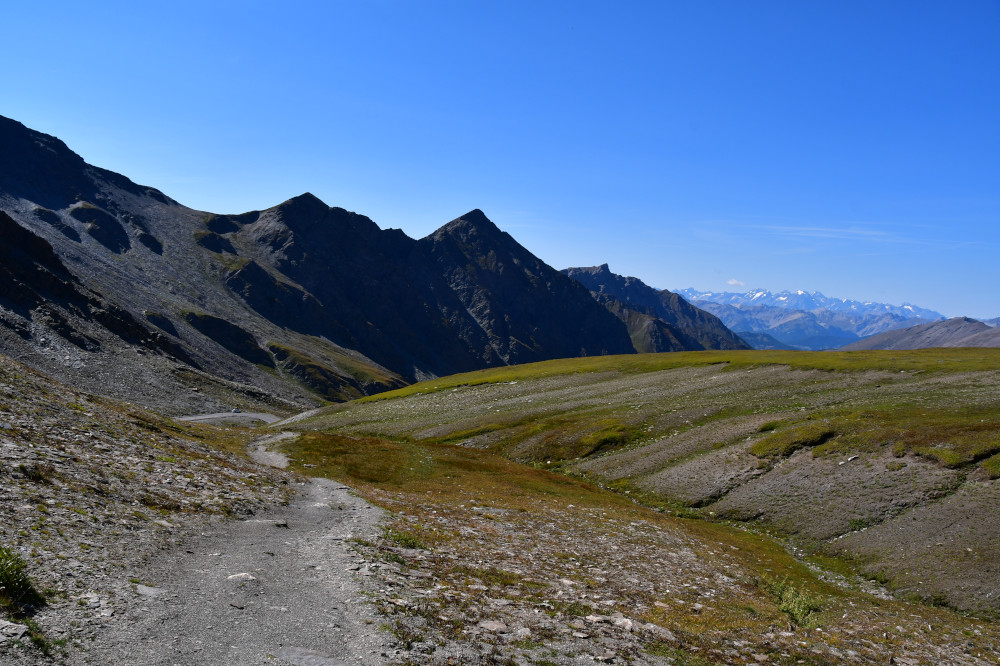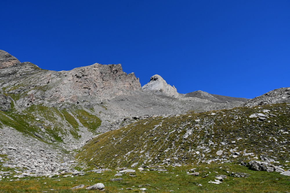 Descendre de la crête en direction de l'est-nord-est (en direction du pic d'Asti). Après 350 mètres, bifurquer vers la droite et débuter une grande boucle vers le sud-est afin de contourner une butte pas très haute. Traverser le Vallone Del Giarus jusqu'à retrouver un sentier plus ou moins bien marqué menant au col d'Asti.
