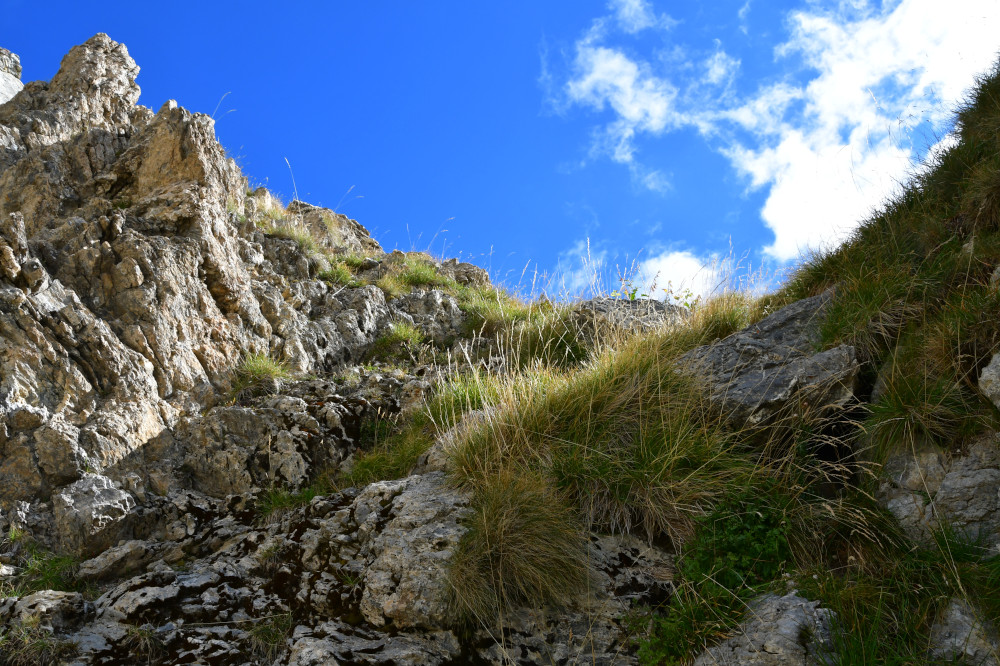 Poursuivre la montée jusqu'au gendarme barrant la ligne de crête. La descente dans une petite cheminée nécessite d'y "mettre les mains", voir "les fesses"... Il est cependant possible de controurner par le bas ce gendarme et de remonter sur la ligne de crête pour poursuivre la montée. Ce petit détour, fait lors du retour, nécessite d'être à l'aise dans une pente relativement forte où il faut rechercher ses appuis pour progresser sans risque de glissade.
