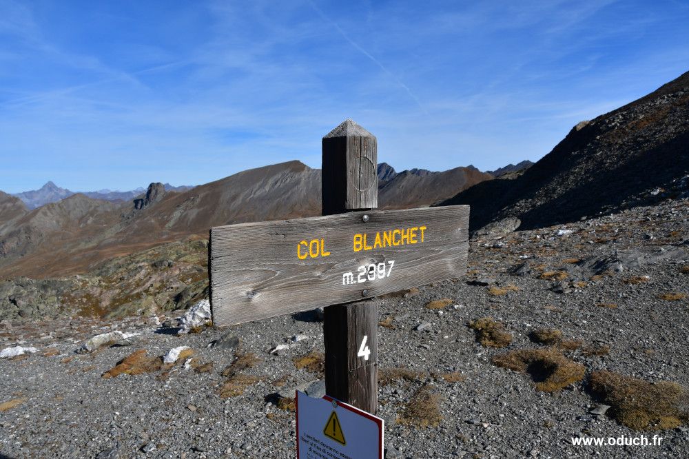 Avant le refuge, suivre sur la droite le sentier menant au col Blanchet (panneaux). Continuer sur ce sentier jusqu'au col (2897 m).