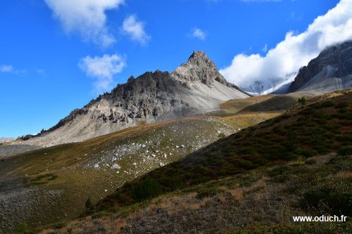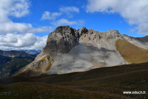 Au col, le sentier disparait. La descente se fait en suivant les traces laissées par les moutons. Ils suivent la pente la moins raide pour atteindre leur pâturage en contrebas. Un peu avant le point 2501, débuter une grande courbe vers la gauche (ouest). Passer près de ce qui ressemble fort à un glacier rocheux. Poursuivre la descente en direction de l'ouest en suivant plus ou moins le tracé d'un ruisseau. Vers la cote 2350, la pente est moins raide, débuter votre parcours en direction du sud-ouest. Au loin, le col de Dormillouse devient visible. Rattraper le sentier du GR5 au fond du vallon de l'Opon. Grimper vers le col en direction du nord. Atteindre le col de Dormillouse.